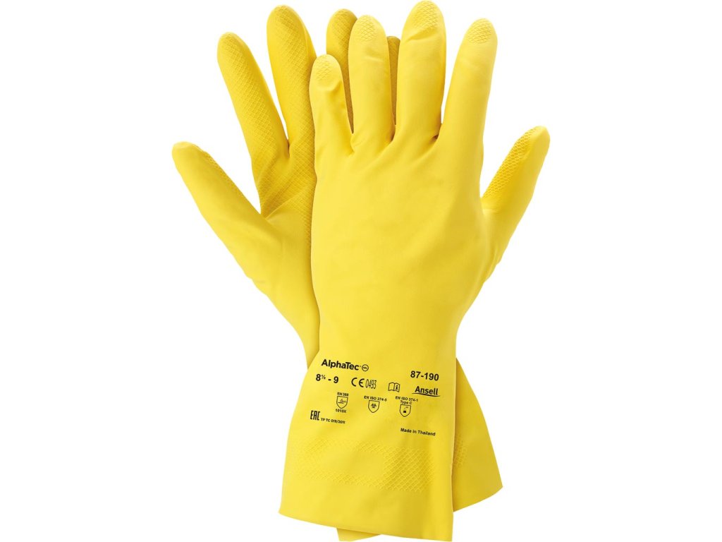 Ochranné rukavice AlphaTec 87-190 (Econohands® Plus). - Vyrobené z prírodného latexu - Vnútorný povrch rukavíc je pokrytý semišovou bavlnou - Špeciálne ošetrené na zníženie rizika alergických reakcií - Povrstvenie rybích šupín na dlani zaisťuje vynikajúcu priľnavosť - Vyhovuje normám EN388 (úrovne odolnosti: 1 0 1 0 X), EN374-5 a EN420Dodatočné parametre