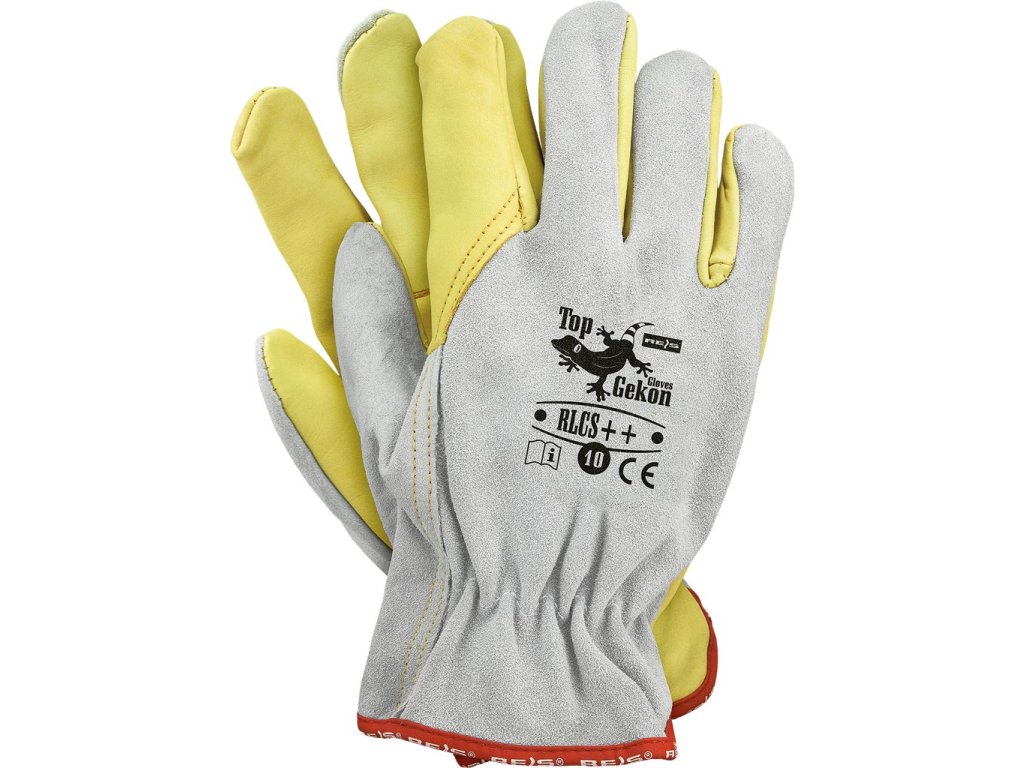 Ochranné rukavice vyrobené z kvalitnej hovädzej kože.- Žltá celozrnná hovädzia koža na rukoväti v kombinácii so svetlou štiepanou kožou na chrbte