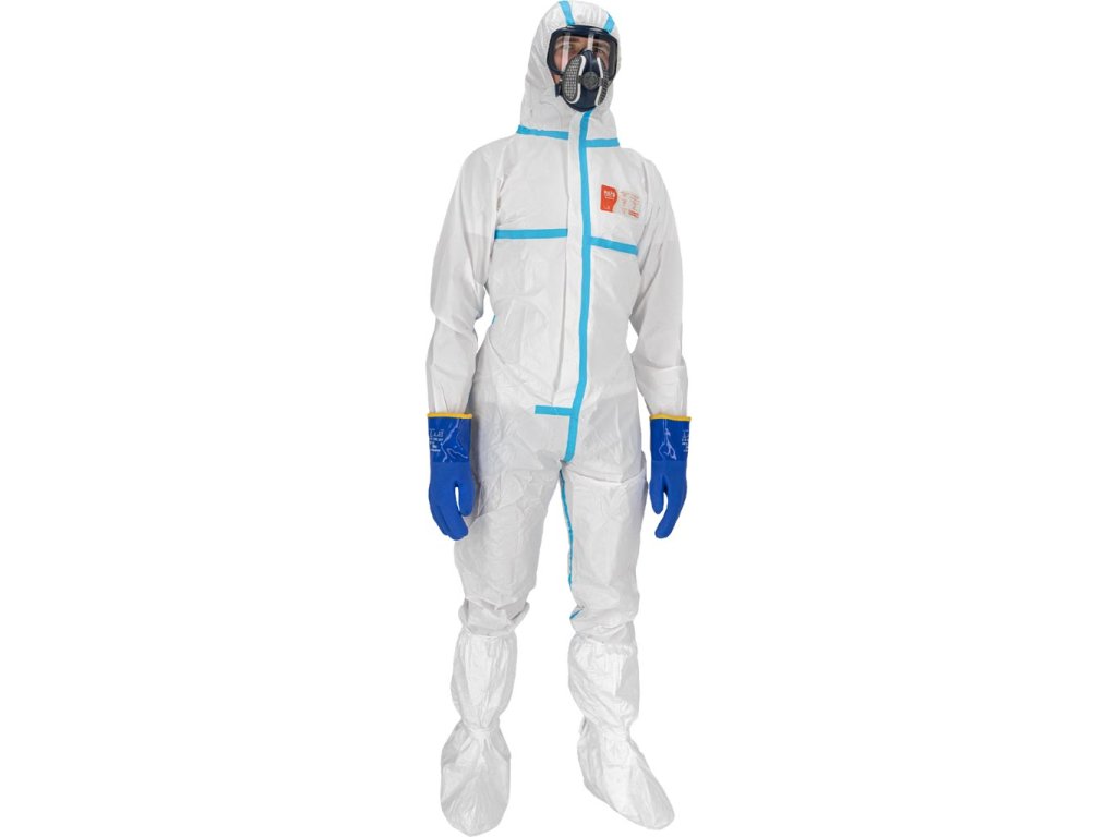Ochranný oblek COV-456 - netkaná textília: 100% polypropylén - gramáž 63 g/m² - potiahnutý mikroporéznou fóliou, ktorá vytvára vynikajúcu ochrannú vrstvu - vynikajúca ochrana pred výparmi kvapalín, pevnými časticami a ľahkými striekajúcimi a postriekanými tekutinami (typ 4-B/5-B/6-B) - zapínanie na zips - kapucňa, rukávy a nohavice sú zakončené elastickými páskami, ktoré zaisťujú lepšiu tesnosť overalu - nariasenie v páse umožňuje lepšie prispôsobenie postave používateľa - modrá páska zaisťujúca švy poskytuje dodatočnú ochranu - vhodný na použitie v poľnohospodárstve a záhradníctve