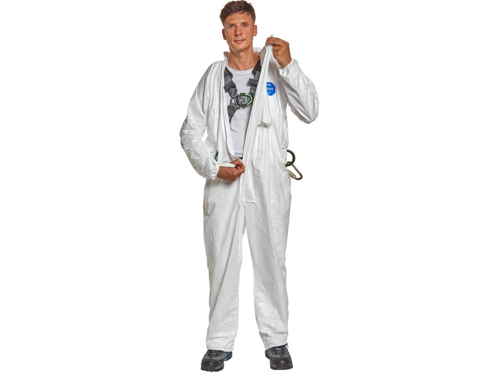 Ochranný oblek TYVEK® 500 HP kompatibilný s bezpečnostným postrojom. - Vyrobené z materiálu TYVEK® - Zapínanie na bočný zips krytý ochrannou chlopňou - Vybavený štyrmi prístupovými bodmi (jeden vpredu, jeden vzadu a jeden po stranách) pre bezpečnostný postroj, ktorý sa nosí pod oblekom - Trojvrstvová kapucňa sa optimálne prispôsobí pohybom hlavy a tvárovej maske, aj keď sa nositeľ hýbe - Elastické pútka na palce na rukávoch zabraňujú padaniu rukávov pri zdvíhaní rúk - Rukávy, nohavice a kapucňa sú zakončené elastickými šnúrkami, ktoré zaisťujú tesnejšie priliehanie - Prešívané švy - Vynikajúca ochrana proti chemikáliám (Typ 5), biologickým látkam (5-B, 6-B), obmedzenému postriekaniu kvapalinou alebo striekajúcej kvapaline (Typ 6) a jemným pevným časticiam - Ergonomický strih obleku zaisťuje dokonalé prispôsobenie a ochranu pri pohybe užívateľa - Navrhnuté na použitie s bezpečnostným postrojom - Má antistatické vlastnosti - Spĺňa požiadavky noriem EN1073-2 (trieda 2), EN ISO 13982-1 (typ 5), EN13034 (typ 6) a EN14126 (klasifikácia výkonu 5-B, 6-B)Dodatočné parametre