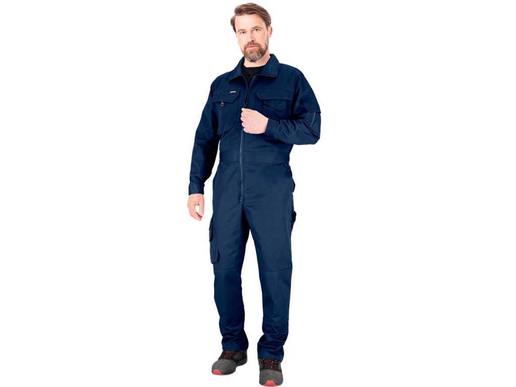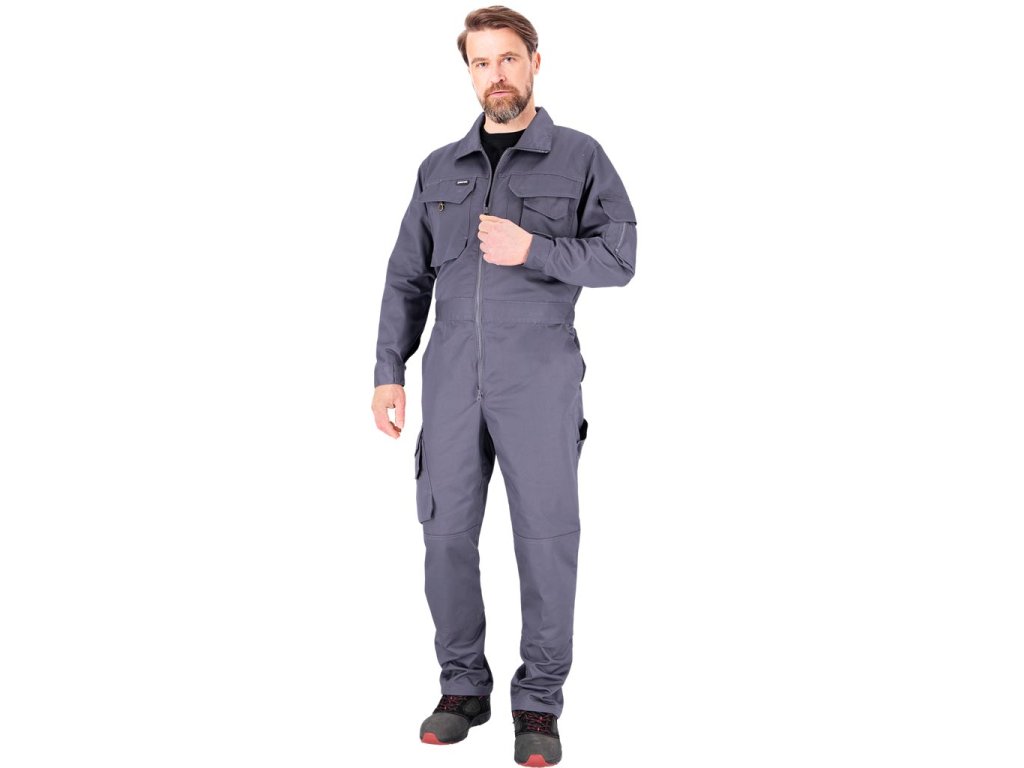 Pánska ochranná kombinéza. - Materiál: 65% polyester, 35% bavlna - Gramáž: 270 g/m² - Zapínanie na dvojcestný zips - Dve náprsné vrecká vrátane jedného dvojitého vrecka so zapínaním na cvok - Dve bočné vrecká a dve zadné vrecká so zapínaním na cvok - Tri vrecká na nohách, vrátane jedného dlhého vrecka s priehradkami - Zospodu plnené vrecká na chrániče kolien - Dvojité vrecko s priehradkami na ľavom rukáve - Elastický pás vzadu pre lepšie prispôsobenie - Držiak preukazu totožnosti - Klip na kľúče - Manžety rukávov so zapínaním na suchý zips pre nastavenie šírkyDodatočné parametre