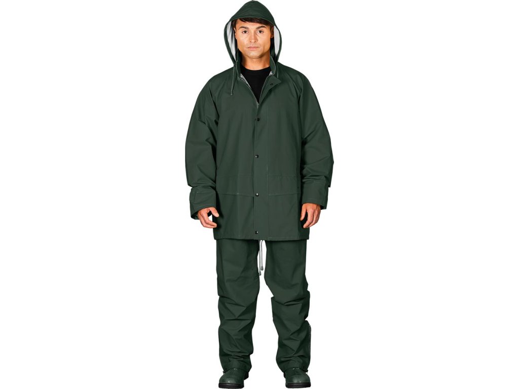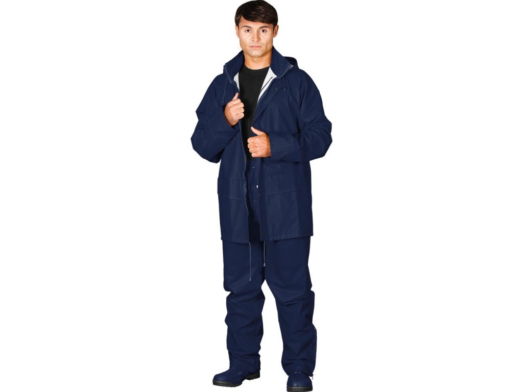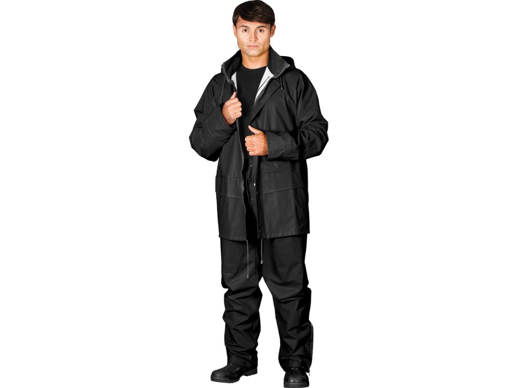 Kvalitná pršiplášť vyrobená z vysoko odolného pružného materiálu. - Vyrobené z PU/PVC - Hrúbka: 0,50 mm - Polyesterová podšívka - Flexibilné, takže neobmedzuje pohyb a poskytuje veľkú voľnosť a pohodlie pri používaní - Bunda a nohavice zabalené vo vrecku so zapínaním na patentky a prídavným vešiakom - Bunda: Zapínanie na zips s prídavnou patentnou chlopňou pevne zakrýva otvor na zips, aby sa zabránilo vniknutiu dažďa a vetra. Kapucňa sa sťahuje šnúrkami a je skrytá v golieri. Dve veľké vrecká v spodnej časti bundy majú chlopne zabraňujúce vniknutiu vody. Manžety sú na vnútornej strane zakončené gumou pre vynikajúcu ochranu pred vetrom. Sťahovacia šnúrka v spodnej časti bundy. Ventilačné systémy na chrbte a pod pazuchami zabezpečujú nevyhnutnú cirkuláciu vzduchu. - Nohavice: Elastický pás. Dodatočné patentky v páse umožňujú prispôsobenie. Nohy so zipsom a patentkami umožňujú nastavenie šírky, poskytujú priliehavé uchytenie v spodnej časti nohy alebo uľahčujú obliekanie nohavíc. - Ideálne do nepriaznivého počasia.Dodatočné parametre