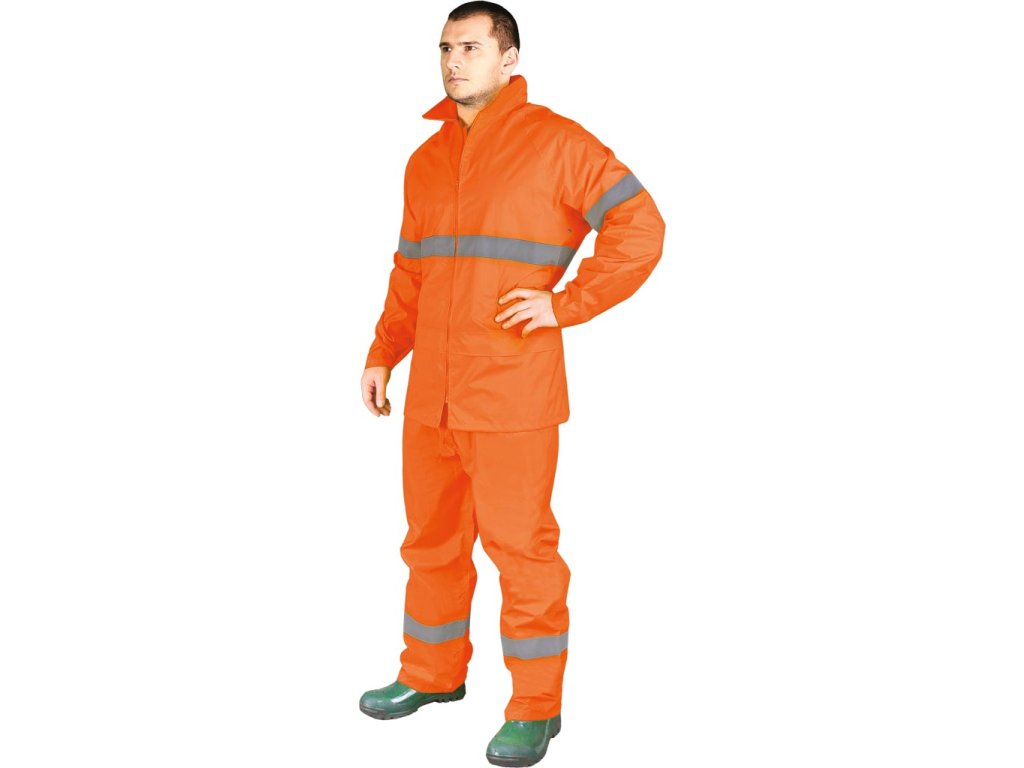 Súprava oblečenia do dažďa. - Látka: 100% polyester potiahnutý PVC - Gramáž: 170 g/m² - Súprava obsahuje nohavice a bundu - Lepené švy poskytujú dodatočnú ochranu proti vniknutiu vody - Bunda: na zips; Kapucňa so sťahovacími šnúrkami skrytá v golieri; Dve spodné vrecká s chlopňami, ktoré zabraňujú vniknutiu vody; Rukávy sa dajú stiahnuť patentkami a lem sa dá stiahnuť šnúrkami pre lepšiu ochranu pred vetrom; Ventilačný systém v podpazuší zaisťuje nevyhnutnú cirkuláciu vzduchu - Nohavice: Elastický pás; Dve bočné vrecká Spodná časť nohavíc sa dá stiahnuť patentkami, čím poskytuje lepšiu ochranu pred vetrom. - Reflexné pásiky pre zvýšenú viditeľnosť. - Balené vo vrecku. - Ideálne do nepriaznivého počasia.Dodatočné parametre