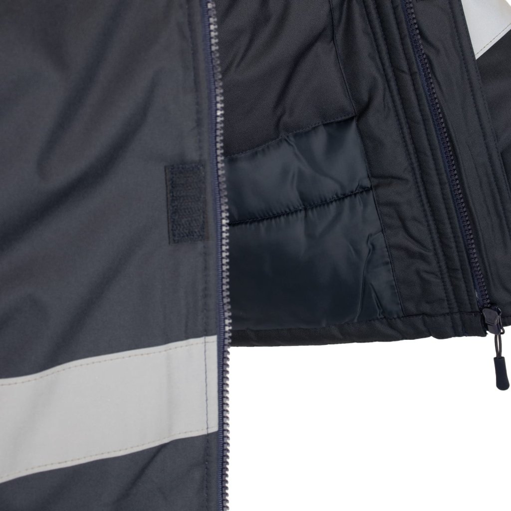 Pánska reflexná a moderná pracovná bunda ASKER L.HOLLMAN. - Vrchná vrstva 100 % polyester 180 g/m² s polyuretánovým záterom - Výplň 100 % polyester 280 g/m² - Podšívka 100 % polyester 60 g/m² - zips s dodatočným zapínaním na suchý zips - stojatý golier - odnímateľná kapucňa so sťahovacími šnúrkami a dodatočným zapínaním na suchý zips pre lepšiu ochranu hlavy pred chladom - štyri náprsné vrecká, z toho dve so zipsom - dve vrecká v spodnej časti bundy - ďalšie vrecká na príslušenstvo - Vnútorné vrecko na suchý zips - Rebrované manžety - Reflexné pruhy pre lepšiu viditeľnosť