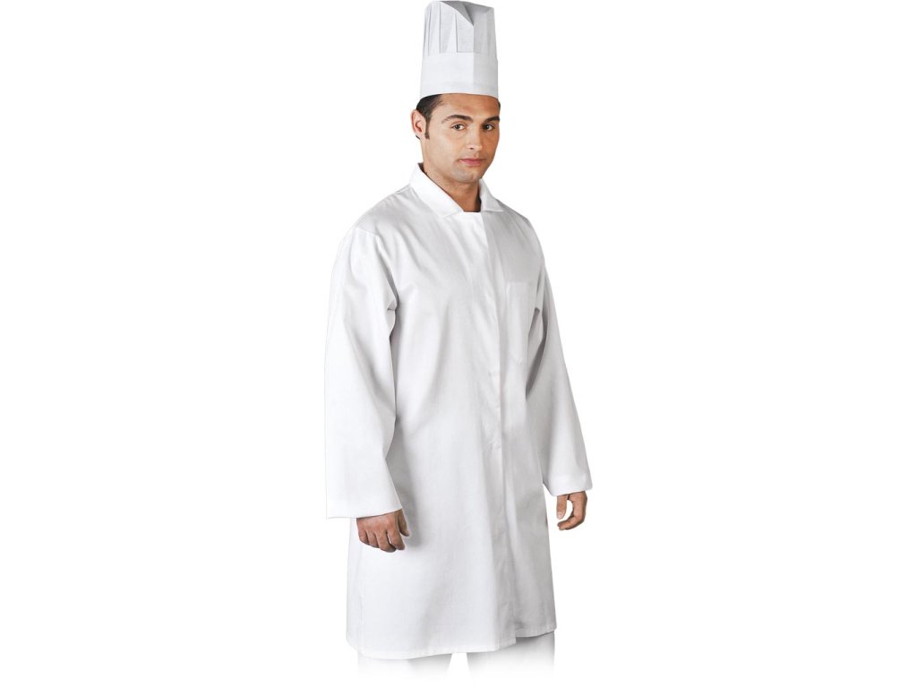 Pánska ochranná zástera. - Materiál: 65% polyester, 35% bavlna - Gramáž: 200 g/m² - Zapínanie na patentky - Golier s golierom - Vnútorné vrecko na ľavej strane - Vhodné pre HACCP (potravinársky priemysel) - Vhodné na priemyselné pranie (maximálna teplota 95°C)Dodatočné parametre