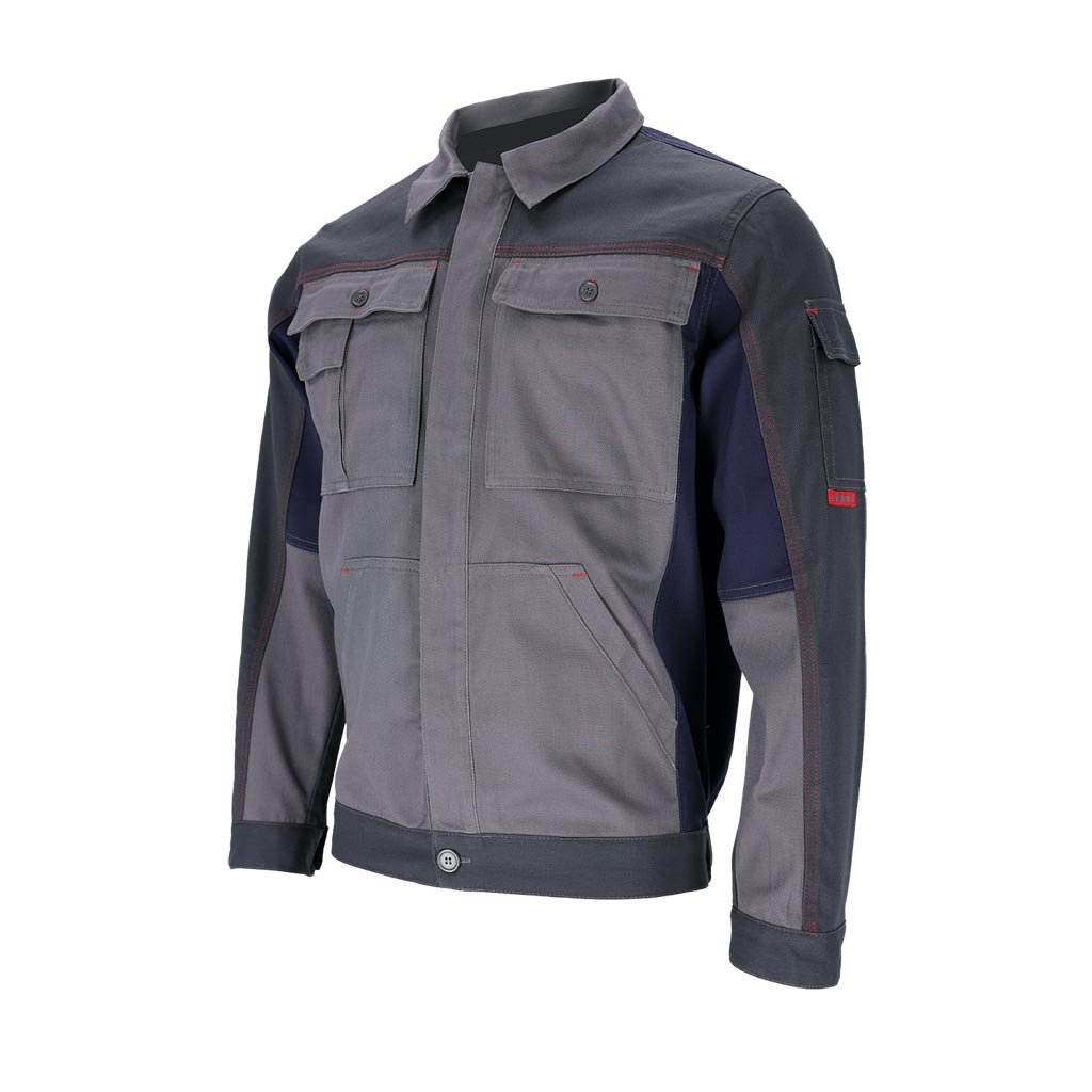 Pánska pracovná bunda BOMER REIS. - materiál: 100% bavlna, 260 g/m² - výstelky z tmavomodrej látky 62% polyester, 34% bavlna, 4% elastan, 240 g/m² - mikina a rukávy sa zapínajú na gombíky - zakončené golierom pri krku - tri náprsné vrecká, z toho dve na gombíky a jedno na suchý zips - dve bočné vrecká v spodnej časti - ďalšie vrecko na ľavom rukáve
