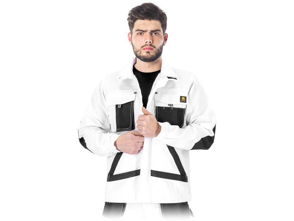 Pánska pracovná bunda OGRIFOX. - Hlavný materiál: 80 % polyester, 20 % bavlnené plátno, 260 g/m² - Vložky: 100 % polyesterová látka 600D Oxford, 200 g/m² - Zapínanie na zips s dodatočným suchým zipsom - Stojáček - Dve dvojité vrecká v spodnej časti a dve dvojité vrecká na hrudi, zapínané na suchý zips - Vystužené lakte - Rebrované manžety na rukávoch