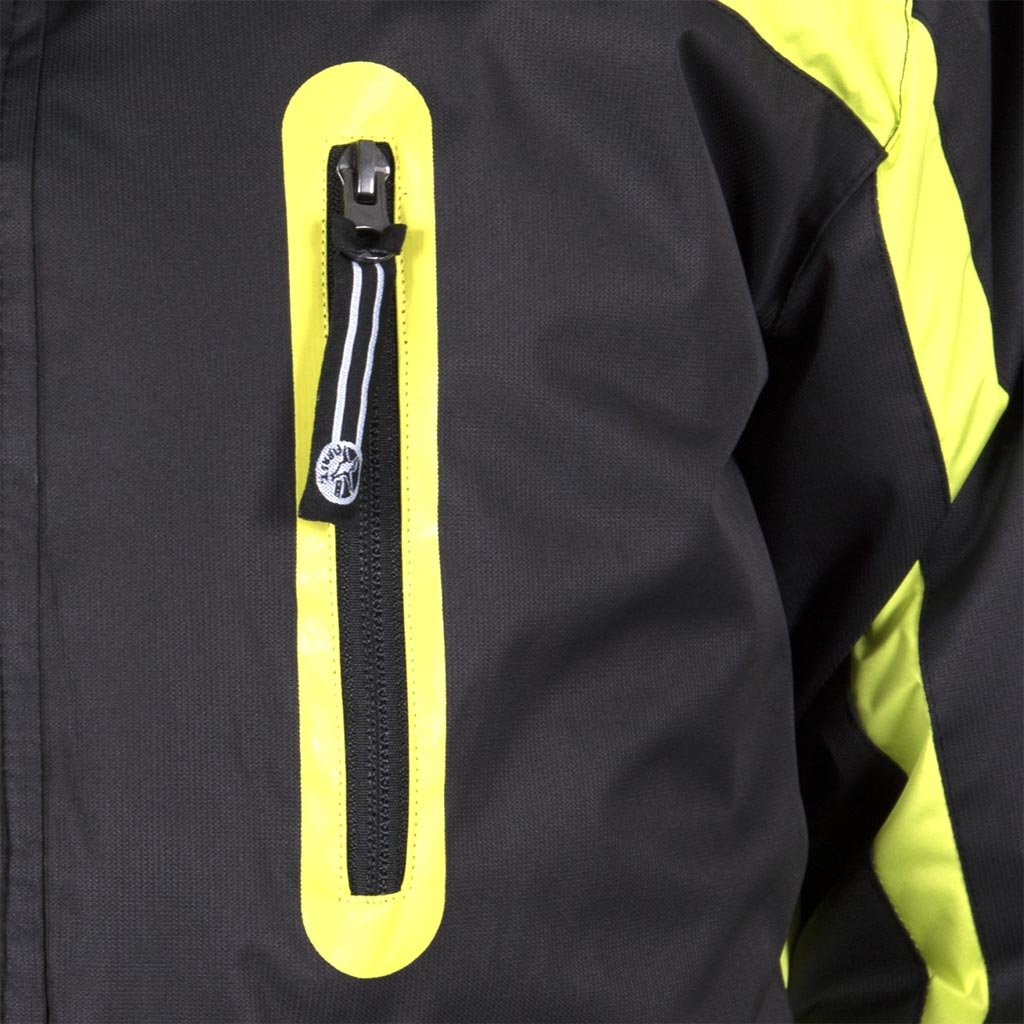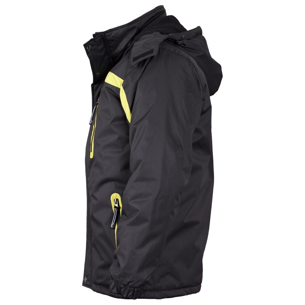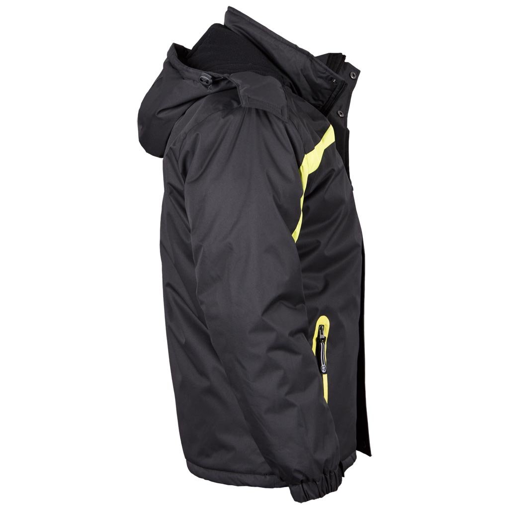 Pánska zateplená pracovná bunda. - materiál: 100% polyester s PVC povlakom, 150 g/m2 - podšívka: 100% polyester, 160 g/m2 - podšívka: vrchná časť: flís (100% polyester), 150 g/m2, spodná časť a rukávy: 100% polyester taft 210T, 50 g/m2 - zapínanie na zips s ďalšími patentnými cvočkami a suchým zipsom - stojačik - odnímateľná kapucňa s flísovou podšívkou, stiahnutá šnúrkami a ďalším suchým zipsom pre lepšiu ochranu hlavy pred chladom - dve spodné vrecká a jedno na hrudi, zapínané na zips - vnútorné vrecko so zapínaním na suchý zips - rukávy zakončené gumičkami so zapínaním na suchý zips, ktoré umožňujú nastavenie ich šírky - spodná časť bundy sa dá stiahnuť šnúrkami - strih: REGULAR