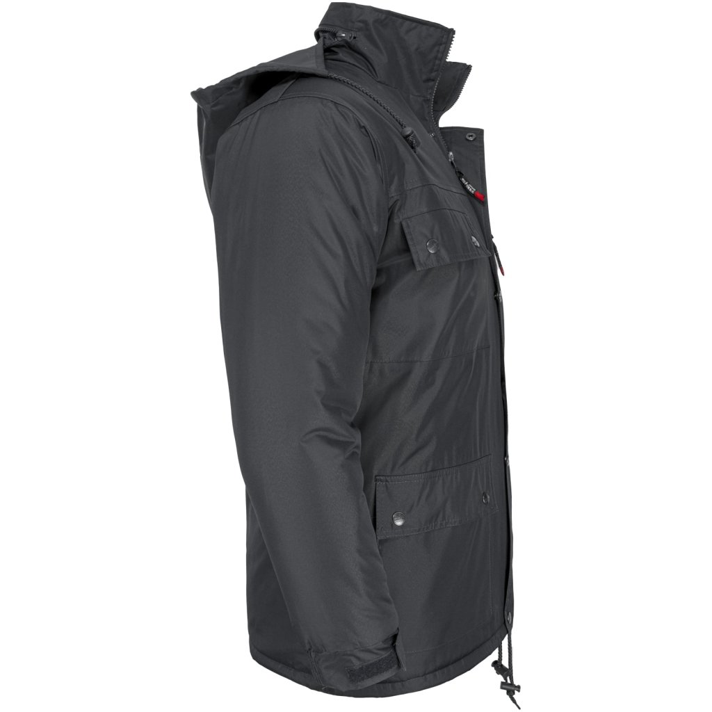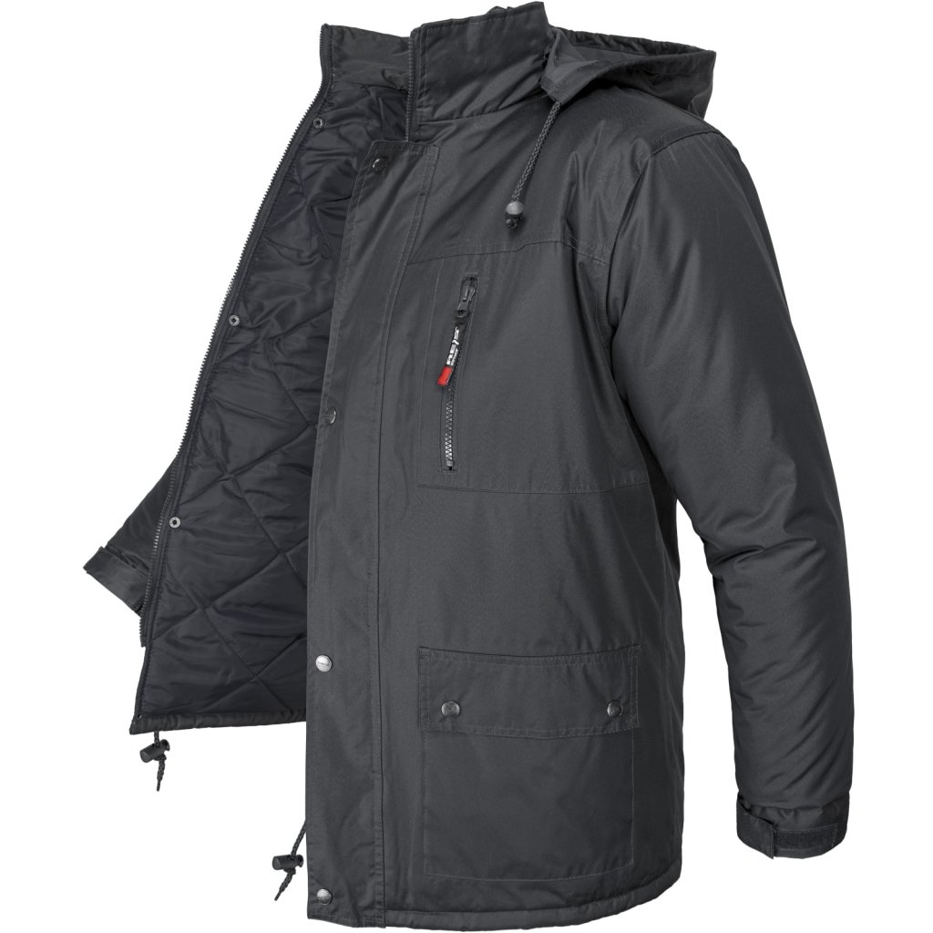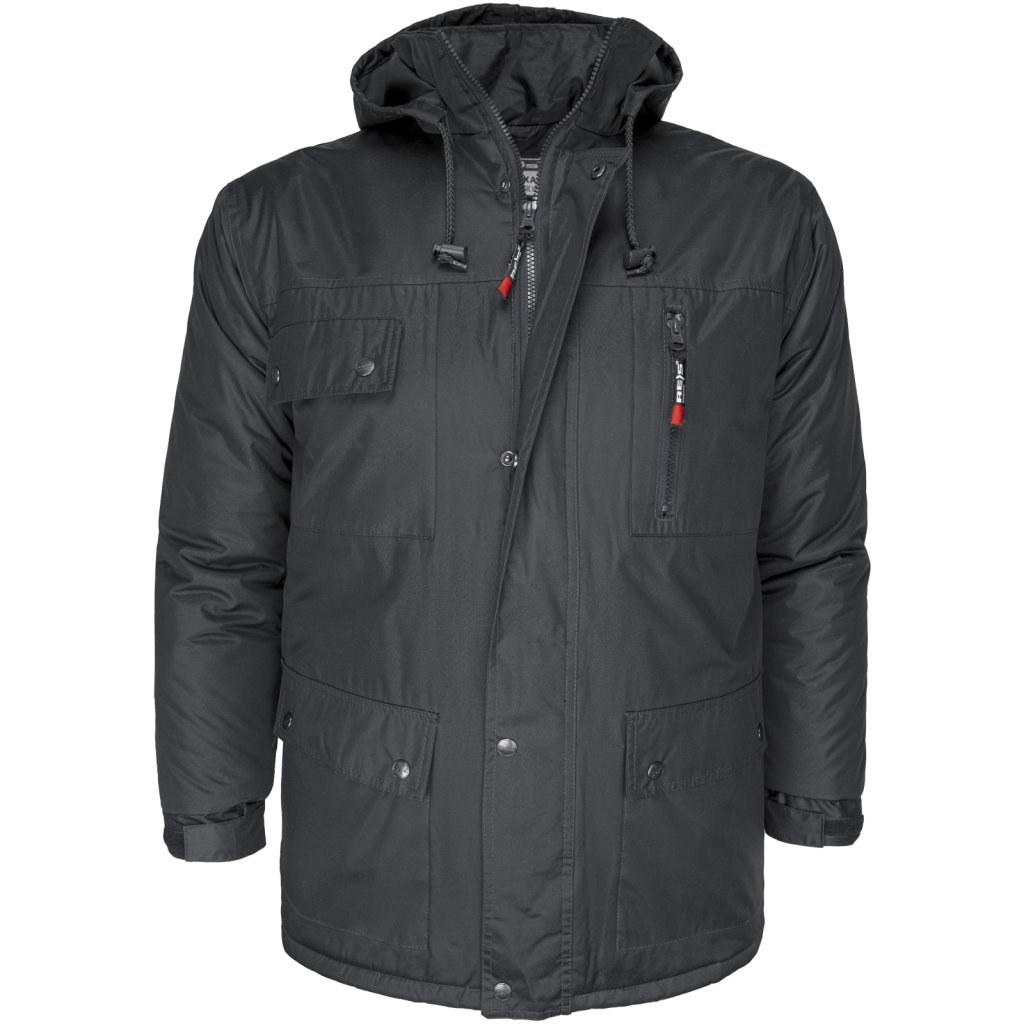 Pánska zateplená pracovná bunda s kapucňou. - Materiál: 100 % polyesterová bunda s PVC záterom, 250 g/m² - Výplň: 100 % polyester, 180 g/m² - Podšívka: 100 % polyester 190T taft, 60 g/m² - Zapínanie na zips s dodatočným zapínaním na patentný patent - Stojatý golier - Kapucňa so sťahovacími šnúrkami, ktoré sa dajú zrolovať a zaistiť suchým zipsom - Dve spodné vrecká so zapínaním na patentný patent a dve na hrudi, jedno so zapínaním na patentný patent a jedno so zipsom - Vnútorné vrecko so zapínaním na suchý zips - Rebrované manžety s dodatočným zapínaním na suchý zips - Nastaviteľný spodný lem so sťahovacími šnúrkami - Vetrací systém na chrbte a v podpazuší umožňuje cirkuláciu vzduchu a zvyšuje pohodlie - Uvoľnený strih