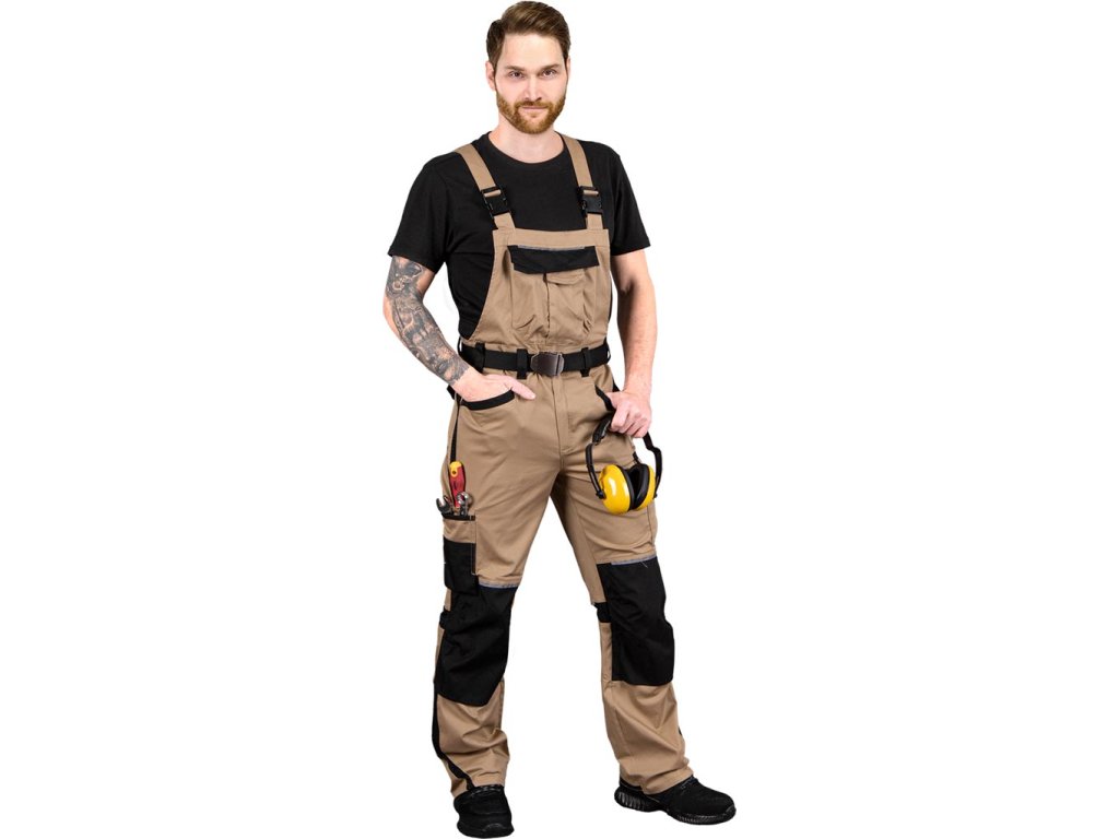 Pracovné montérky na traky DESERT L.HOLLMAN pre mužov, ktoré ideálne do horúcich dní kvôli svojmu zloženiu - 97 % bavlna, 3 % spandex - gramáž 180 g/m² - Sieťované vložky vyrobené z 80 % nylonu a 20 % spandexu s gramážou 170 g/m² - Dve náprsné vrecká so zapínaním na suchý zips - Dve bočné vrecká - Dve zadné vrecká so zapínaním na suchý zips - Štyri vrecká na nohaviciach, z toho dve so zapínaním na suchý zips - Elastický pás vzadu zvyšuje voľnosť pohybu a umožňuje lepšie prispôsobenie - Dĺžku je možné nastaviť pomocou trakov, ktoré majú tiež gumu vzadu - Vrecká na kolená na kolenách - Reflexné prvky - Sieťované vložky pozdĺž nohavíc a vzadu na kolenách zabezpečujú lepšie vetranie - Zvýšená odolnosť vďaka vložkám z Cordury - Slučka na kladivo na ľavej nohavici