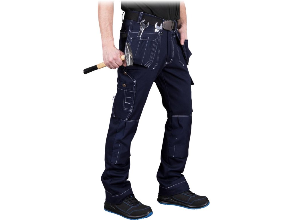 Pracovné nohavice na náradie do pása L.HOLLMAN. - Hlavný materiál: 100 % bavlnená keprová tkanina, 350 g/m² - Vložky: 100 % nylonová tkanina Cordura 50D, 200 g/m² - Zapínanie na gombík a zips - Dve bočné vrecká, dve vrecká pre mechanikov s priehradkami a dve zadné vrecká - Vrecká na nohaviciach, vrátane jedného dvojitého s úzkym vreckom a jedného dvojitého dlhého s priehradkou, napr. na pero - Spodné vrecká na chrániče kolien - Predtvarované kolená - Úchyty na kľúče - Držiaky na náradie po stranách - Určené pre montérov - Strih: REGULAR