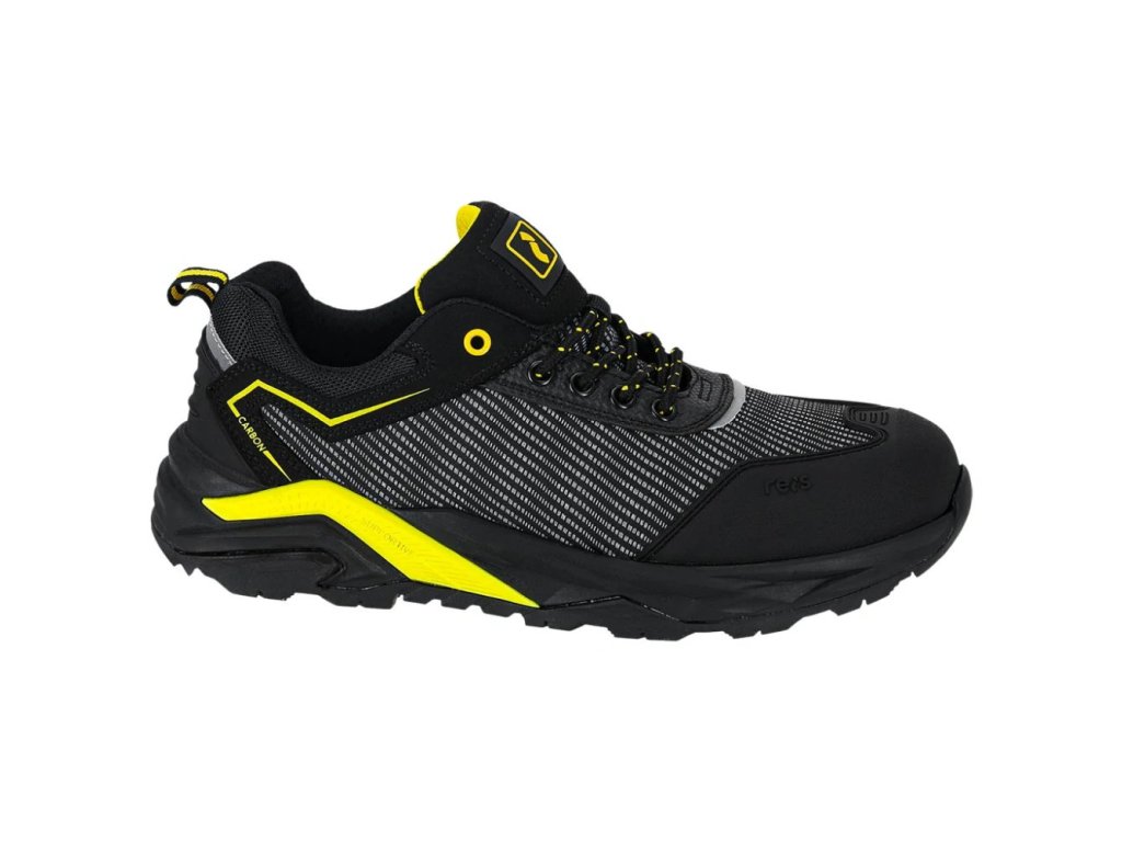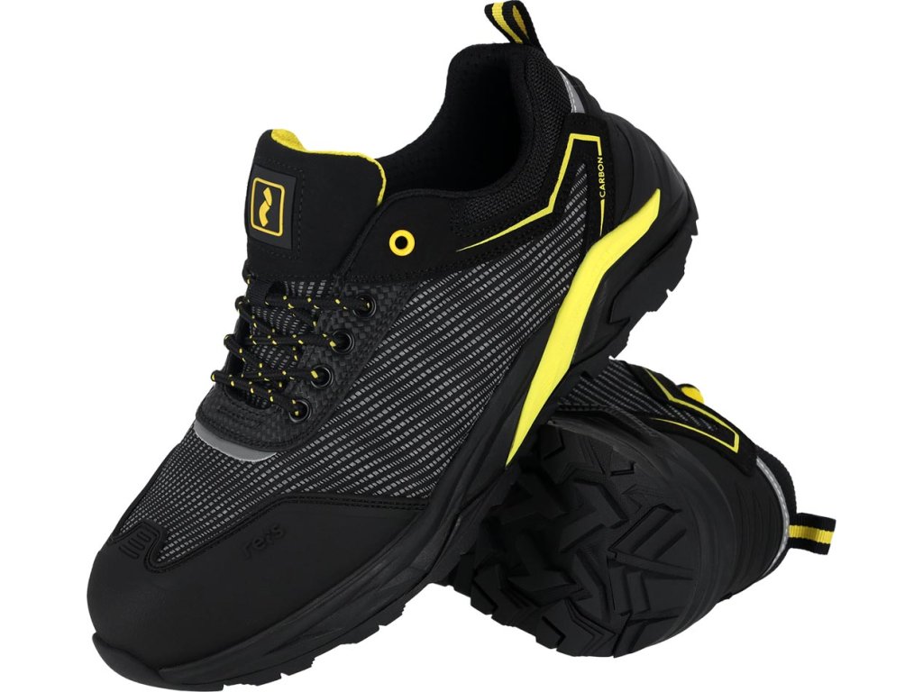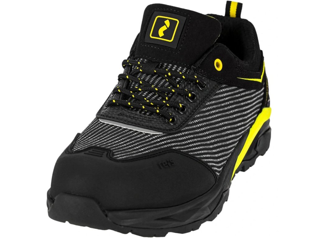Pánske pracovné poltopánky S3S CARBON REIS. - Vyrobená z polyesterovej tkaniny v kombinácii so semišovou syntetickou kožou (mikrovlákno) a TPU vložkami - Nízky strih topánky, siahajúce nad členok - Šnurovanie - Protišmyková, olejuvzdorná, antistatická podrážka z EVA a gumy - Tlmenie nárazov pod pätou - Nekovová kompozitná vložka chráni chodidlo pred prepichnutím tlakom 1100 N - Kompozitná špička odolná voči nárazom 200 J a tlakovým silám až 15 kN - Gumový povlak zabraňuje oderu - Bez kovových povrchových úprav - BEZ KOVOV - Reflexné prvky - Kategória S3S FO SR
