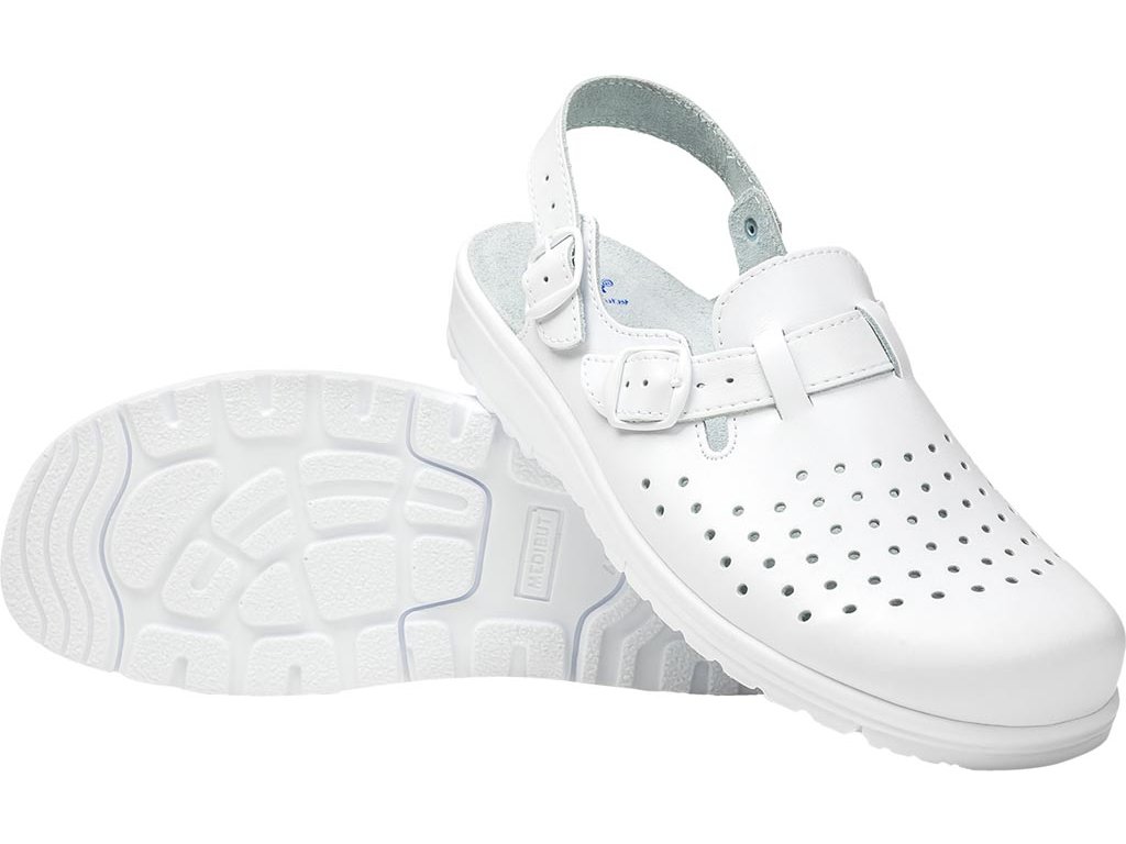 Pánske zdravotnícke topánky MEDIBUT. - Perforovaný zvršok z bielej pravej kože s remienkom na nastavenie šírky, odolný voči každodennému praniu a dezinfekcii. - Podšívka z pravej kože. - PU podrážka s ortopedickým profilom. - Protišmyková ochrana. - Remienok na päte. - Spĺňa požiadavky normy EN20347.