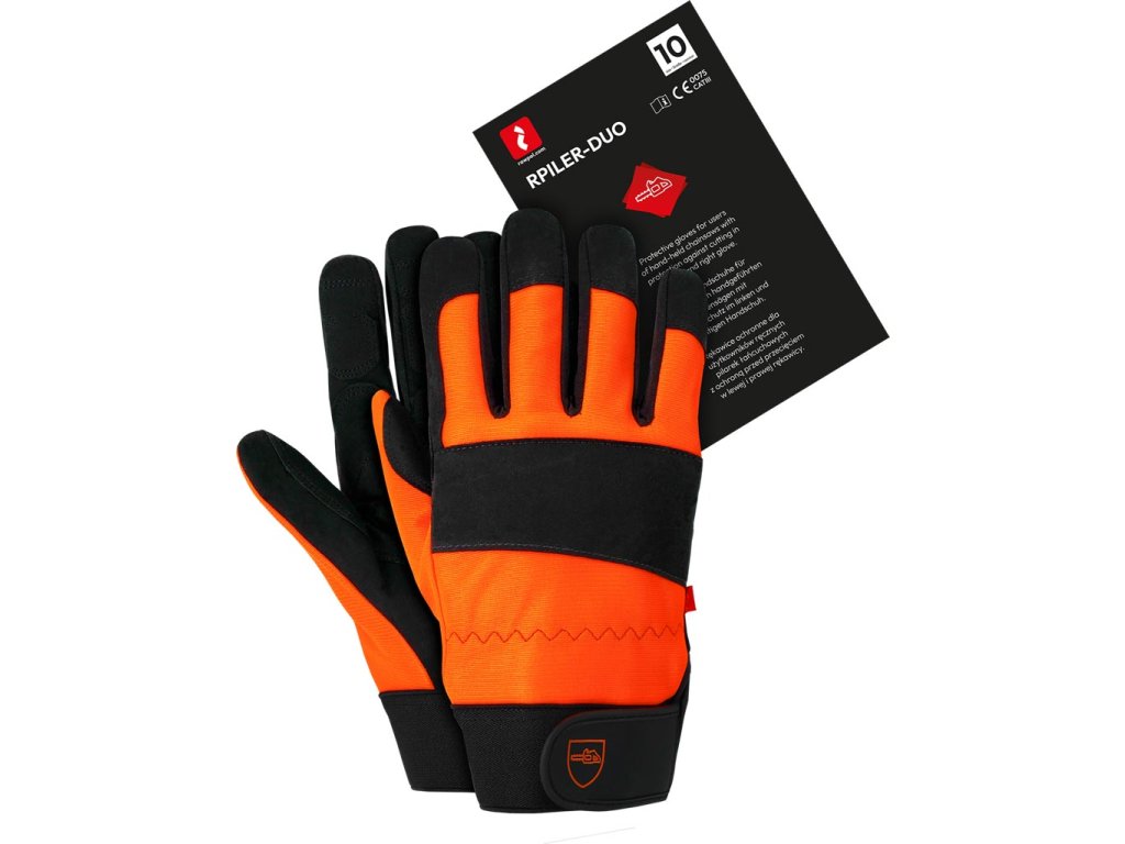 Pilčícke a lesnícke pracovné rukavice REIS. - Vyrobené zo syntetickej kože v kombinácii s oranžovým polyesterovým úpletom. - Výstuž zo syntetickej kože medzi palcom a ukazovákom. - Podšívka z EVA peny na vnútornej strane rukoväte zabraňuje mozoľom a oderom. - Výstuž zo syntetickej kože medzi palcom a ukazovákom. - Ukončené manžetou s dodatočným zapínaním na suchý zips pre jednoduché nastavenie. - Súčasťou balenia je ochrana ruky proti reťazovej píle na ľavej a pravej strane rukavíc. - Najvyššia odolnosť proti oderu (4). - Určené pre používateľov ručných reťazových píl.