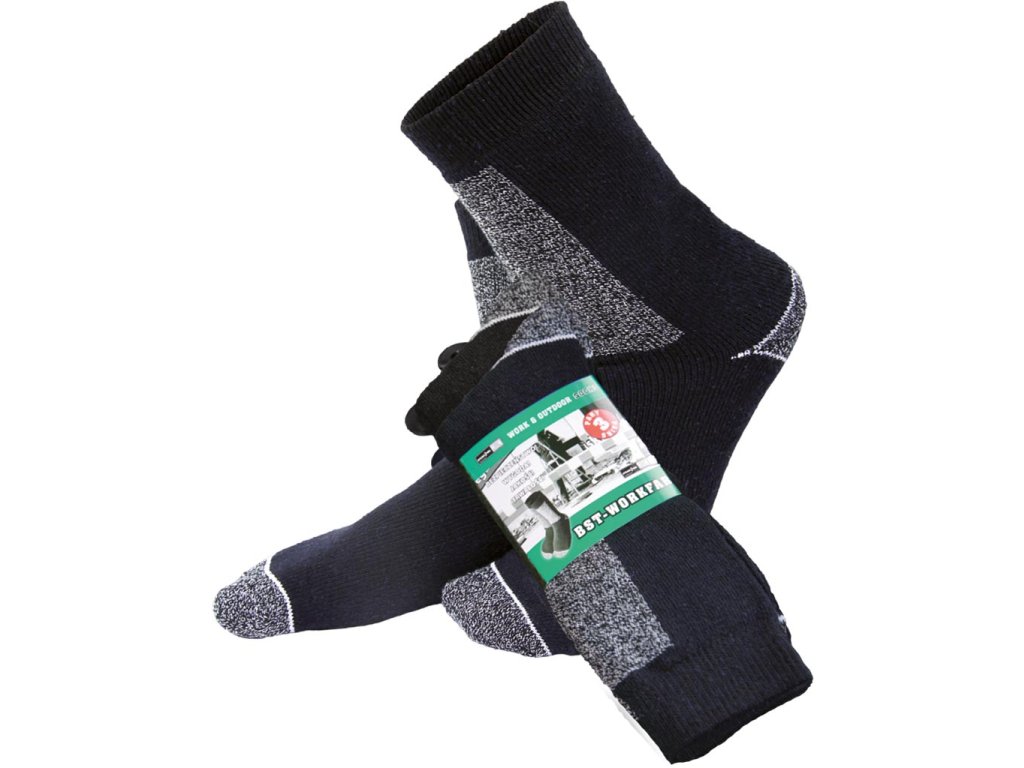 Ponožky do práce aj na každodenné nosenie. - Úplet: 52 % bavlna, 46 % polyester, 2 % elastan - Hmotnosť páru: približne 62 g - Dostupné v dvoch farbách: námornícka modrá (2 páry) a čierna (1 pár) - obe so sivým lemom na špičke, päte a vrchnej časti ponožky - Poskytujú vysoký komfort a spokojnosť užívateľa - Dodávané na malom vešiaku pre jednoduché vystavenie - Minimálna predajná jednotka: 3 páryDodatočné parametre