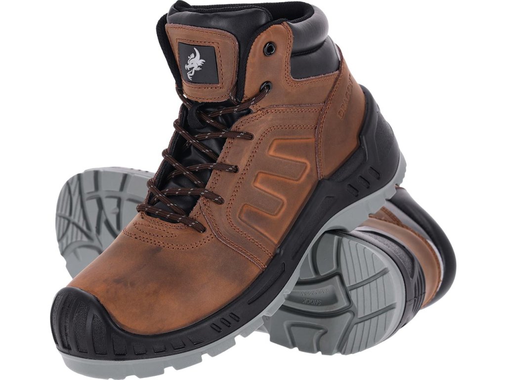 Členková pánska pracovná obuv S3 TITAN-BRONCO REIS. - Vyrobená z hovädzej nubukovej kože Crazy Horse - Členkové čižmy - Šnurovanie - Protišmyková, olejuvzdorná a antistatická podrážka z polyuretánu s dvojitou hustotou - Tlmenie nárazov pod pätou - Nekovová kevlarová vložka chráni chodidlo pred prepichnutím tlakom 1100 N - Kompozitná špička odolná voči nárazom 200 J a tlakovým silám až 15 kN - Gumový povlak zabraňuje oderu špičky pri trení o zem - Reflexné prvky - Kategória S3S FO SR