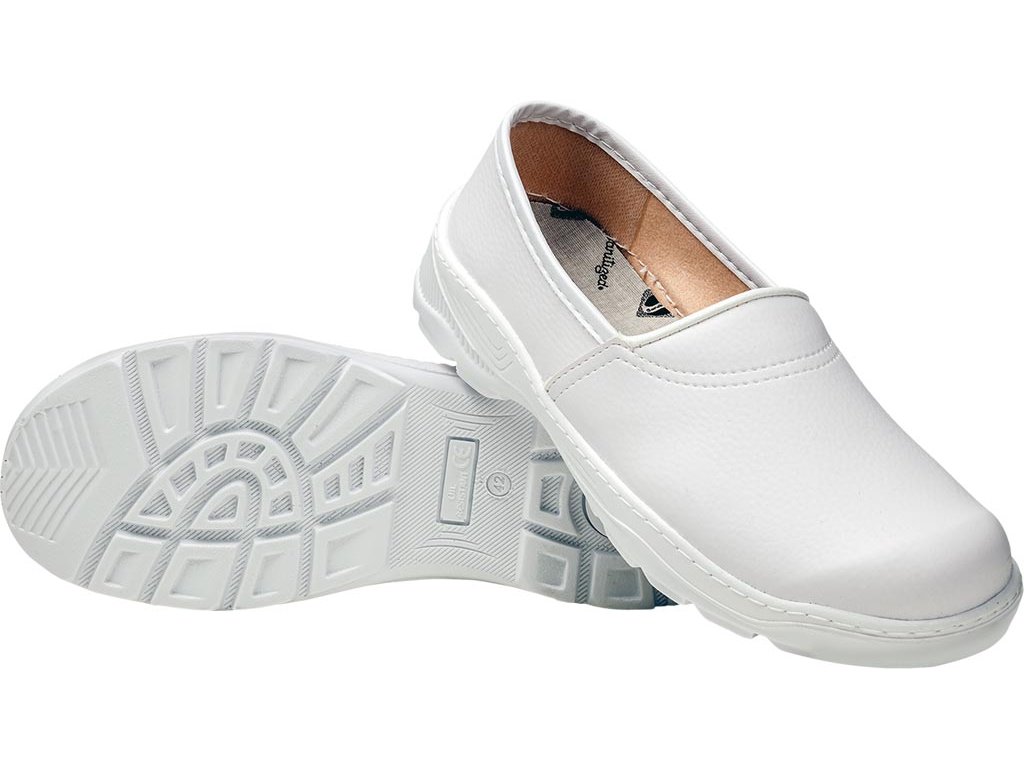Pracovná obuv. - Nízke členkové topánky v mokasínovom štýle - Syntetický zvršok - Vybavené odnímateľnou, netkanou podšívkou impregnovanou certifikovaným antibakteriálnym a protiplesňovým činidlom - Lepené podrážky s dodatočným zosilneným prešívaním po obvode, vyrobené z termoplastickej gumy s vodoodpudivým behúňom - Protišmyková podrážka odolná voči olejom, rastlinným tukom a živočíšnym tukom - Vhodné pre použitie v systéme HACCP (potravinársky priemysel) - Možno prať na 40°C - Spĺňa požiadavky normy EN20347Dodatočné parametre