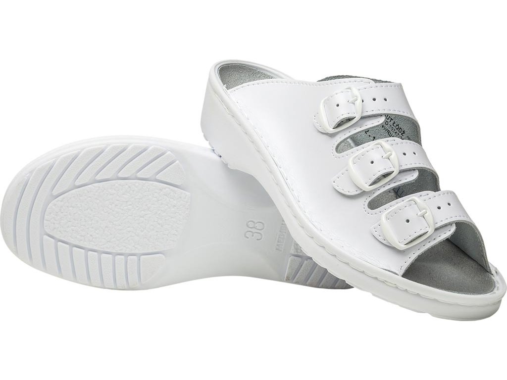 Žabky s protišmykovou podrážkou. - Kožený zvršok prišitý k podrážke vonkajším prešívaním - Tri popruhy na prispôsobenie - Protišmyková podošva s anatomickým ortopedickým profilom, vyrobená z expandovaného polyuretánu, s výškou podrážky 1,5-2 cm pod chodidlom a výškou podrážky 3,5-4 cm pod pätou - Úplný ortopedický profil - Kožená podšívka - Spĺňa požiadavky normy EN20347Dodatočné parametre