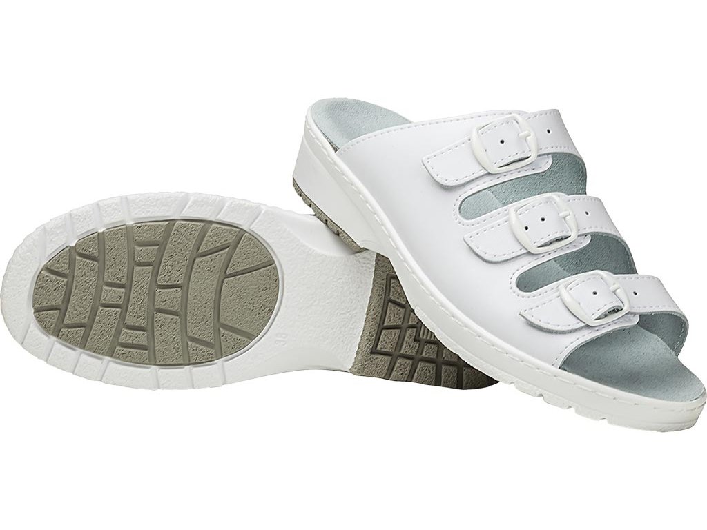Dámske ochranné šľapky. - Zvršok vyrobený z mäkkej prírodnej kože s nastaviteľnými popruhmi na podporu klenby - Vymeniteľná, anatomická, antistatická, antibakteriálne impregnovaná prírodná kožená stielka s plným ortopedickým profilom pre ľahké čistenie, s možnosťou dokúpenia náhradnej - podrážka vyrobená z ľahkého a flexibilného PU s protišmykovými a antistatickými vlastnosťami a hlbokým protišmykovým dezénom - Lepená montáž a dodatočné spevňujúce prešívanie po obvode - Spĺňa požiadavky normy EN20347Dodatočné parametre