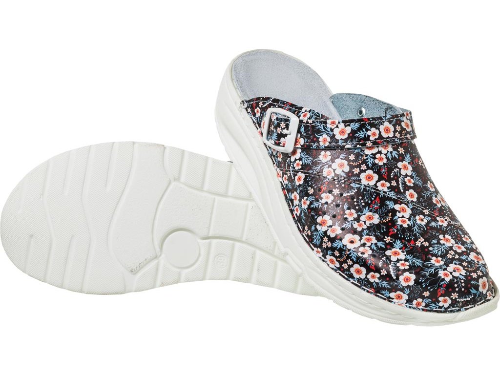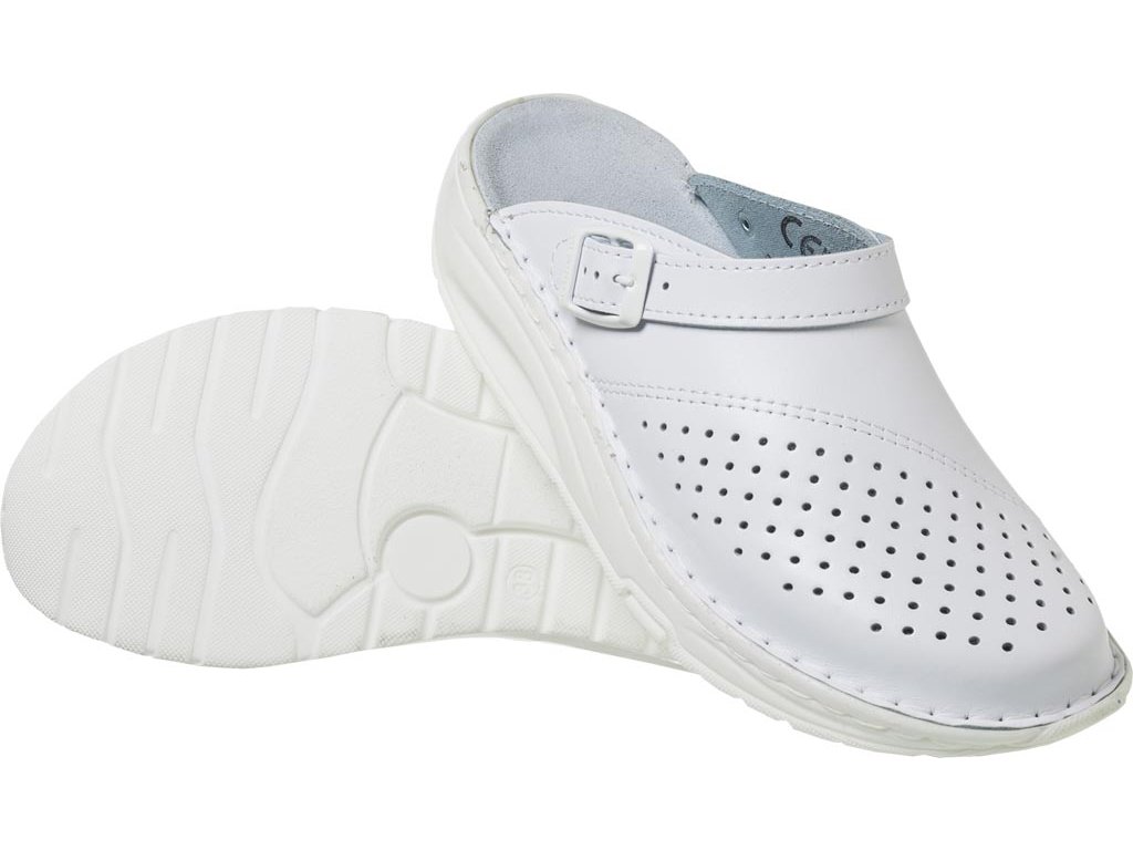 Dámska pracovná obuv s kolískovou podrážkou. - Perforovaný kožený zvršok, prišitý k podrážke vonkajším stehom - Dvojfunkčný remienok, premiestniteľný na päte - Kožená podšívka impregnovaná baktericídnym a fungicídnym činidlom, spojená s hubkou s aktívnym uhlím - Protišmyková podrážka kolísky - Antistatický s anatomickým ortopedickým profilom, vyrobený z expandovaného polyuretánu - Výška stielky: 1,5-2 cm, Výška podpätku: 3,5-4 cm - Úplný ortopedický profil - Spĺňa požiadavky normy EN ISO 20347Dodatočné parametre