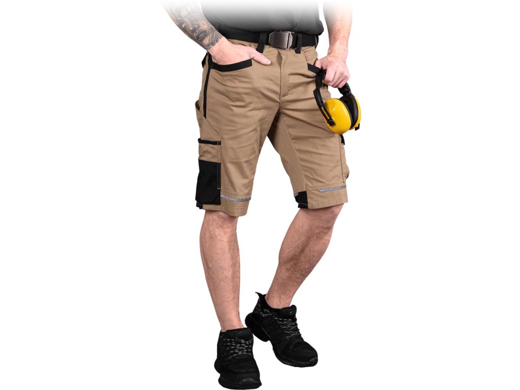 Pracovné pracovné kraťasy DESERT L.HOLLMAN. - 97 % bavlna, 3 % elastan - gramáž 180 g/m² - Sieťované vložky vyrobené z 80 % nylonu a 20 % elastanu s gramážou 170 g/m² - Dve bočné vrecká - Dve zadné vrecká so zapínaním na suchý zips - Štyri vrecká na nohaviciach, z toho dve so zapínaním na suchý zips - Elastický pás vzadu pre väčšiu voľnosť pohybu a lepšie prispôsobenie - Reflexné prvky - Sieťované vložky pozdĺž nohavíc a vzadu vo výške kolien zabezpečujú lepšie vetranie - Zvýšená odolnosť vďaka vložkám z Cordury - Slučka na kladivo na ľavej nohavici - Ideálne do horúcich dní
