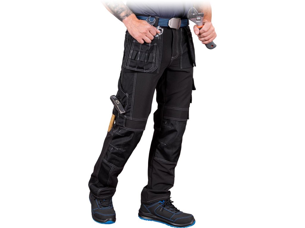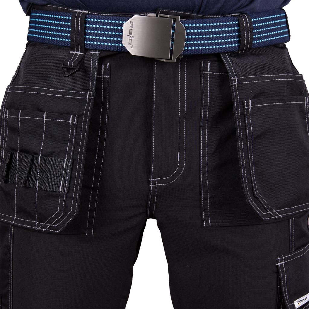 Pánske pracovné nohavice na náradie do pása EVERBLACK L.HOLLMAN. - Hlavný materiál: 92 % polyester, 8 % elastan, rip-stop strečová tkanina, 280 g/m² - Vsadky na vreckách a v dolnej časti nohavíc: 80 % polyester, 20 % bavlna, 270 g/m² - Výstuhy na kolenách: 100 % polyester, oxfordská tkanina, 200 g/m² - Rip-stop tkanina chráni pred roztrhnutím pri zachytení o vyčnievajúci predmet - Zapínanie na gombík a zips - Dve bočné vrecká, dve vrecká Monterrey s priehradkami a dve zadné vrecká - Vrecká na nohaviciach, vrátane jedného trojitého zapínania na suchý zips a jedného pozdĺžneho s priehradkami na príslušenstvo a pútkom na kladivo - Vrecká na kolenné chrániče s vrchným plnením a zapínaním na suchý zips - Klip na kľúče - Reflexné prvky