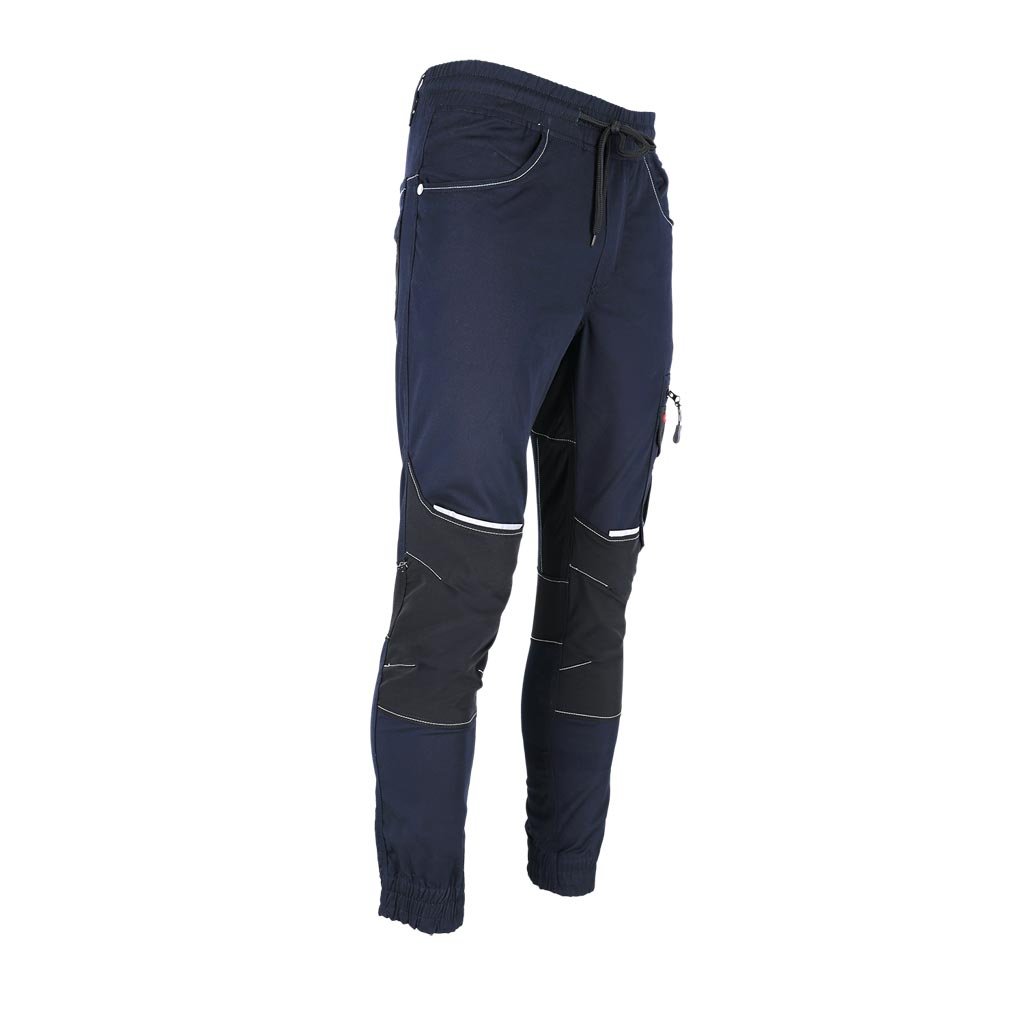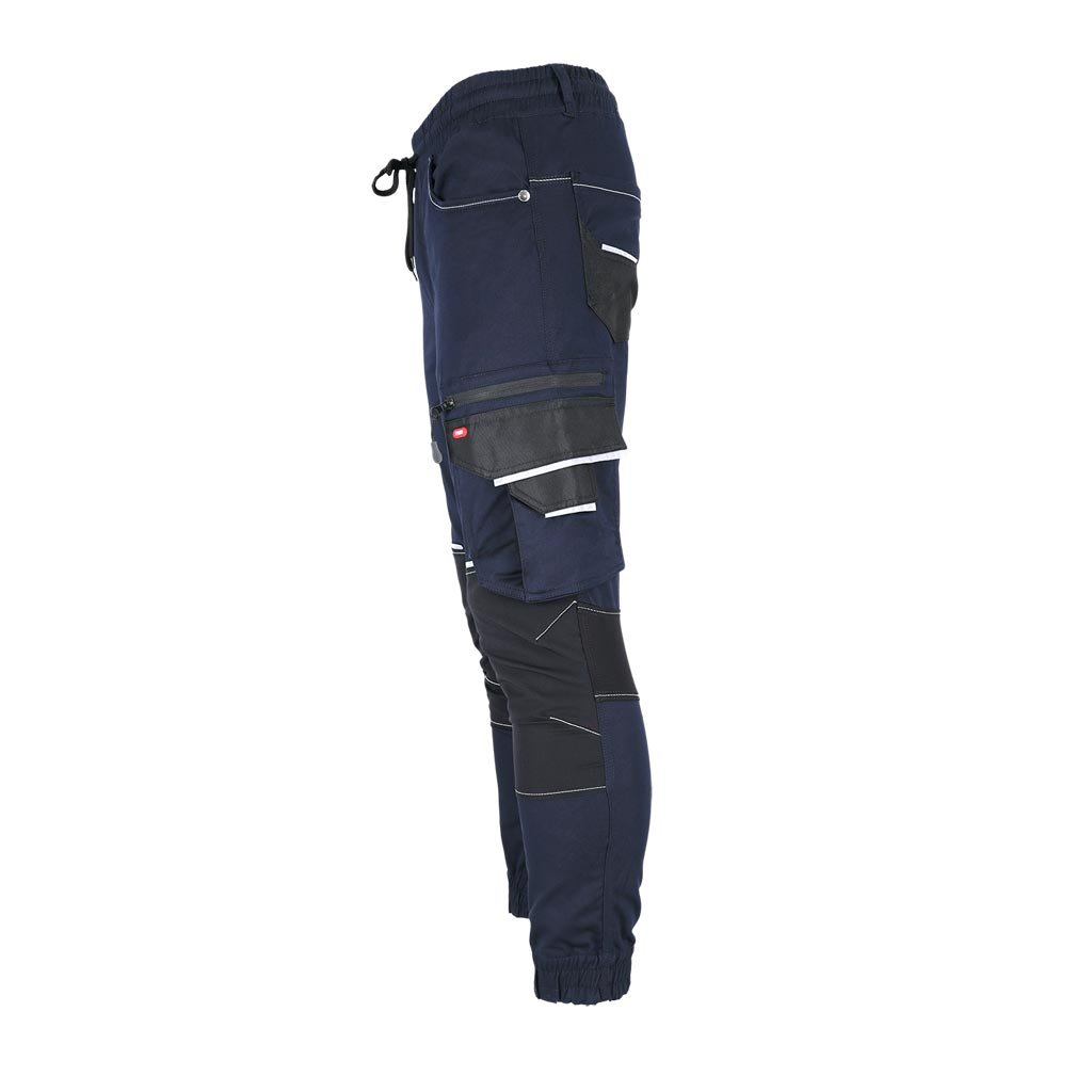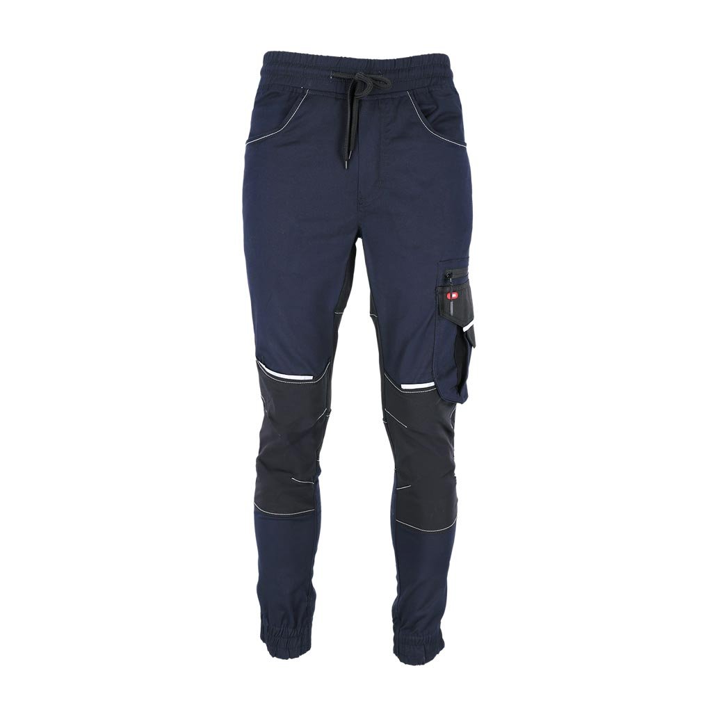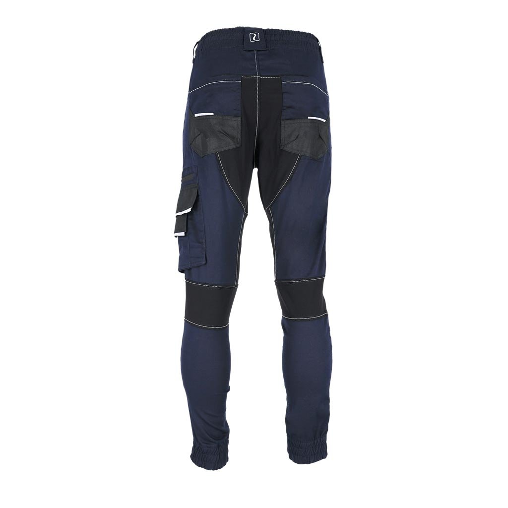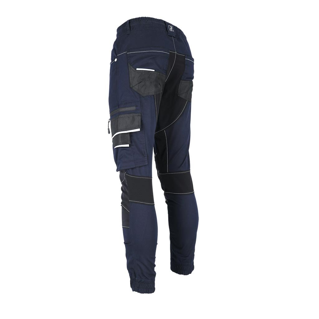 Pánske pracovné nohavice s reflexnými prvkami REIS. - Hlavný materiál: keprová tkanina 60 % bavlna, 37 % polyester, 3 % elastan, 260 g/m² - Vložky: 95 % nylon, 5 % elastan, 260 g/m² - Vložky do vreciek: 100 % polyesterová oxfordská tkanina 600D, 200 g/m² - Elastický pás s nastaviteľnými sťahovacími šnúrkami - Dve bočné vrecká a dve zadné vrecká - Dvojité vrecko na nohaviciach s priehradkou na mobilný telefón - Predtvarované kolená - Elastické manžety - Reflexné prvky pre zvýšenú viditeľnosť
