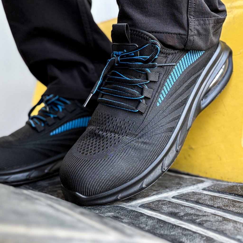 Pánske pracovné poltopánky S1 WAWE REIS. - Vyrobená z pleteného textilného materiálu - Nízky strih topánky, siahajúce nad členok - Navliekanie a sťahovanie šnúrkami - Protišmyková, olejuvzdorná, antistatická podrážka z polyuretánu s dvojitou hustotou - Tlmenie nárazov pod pätou - Nekovová kevlarová vložka chráni chodidlo pred prepichnutím tlakom 1100 N - Oceľová špička odolná voči nárazom 200 J a drveniu do 15 kN - Kategória S1 PL SR FO - Vzduchový vankúš tlmiaci nárazy v podrážke