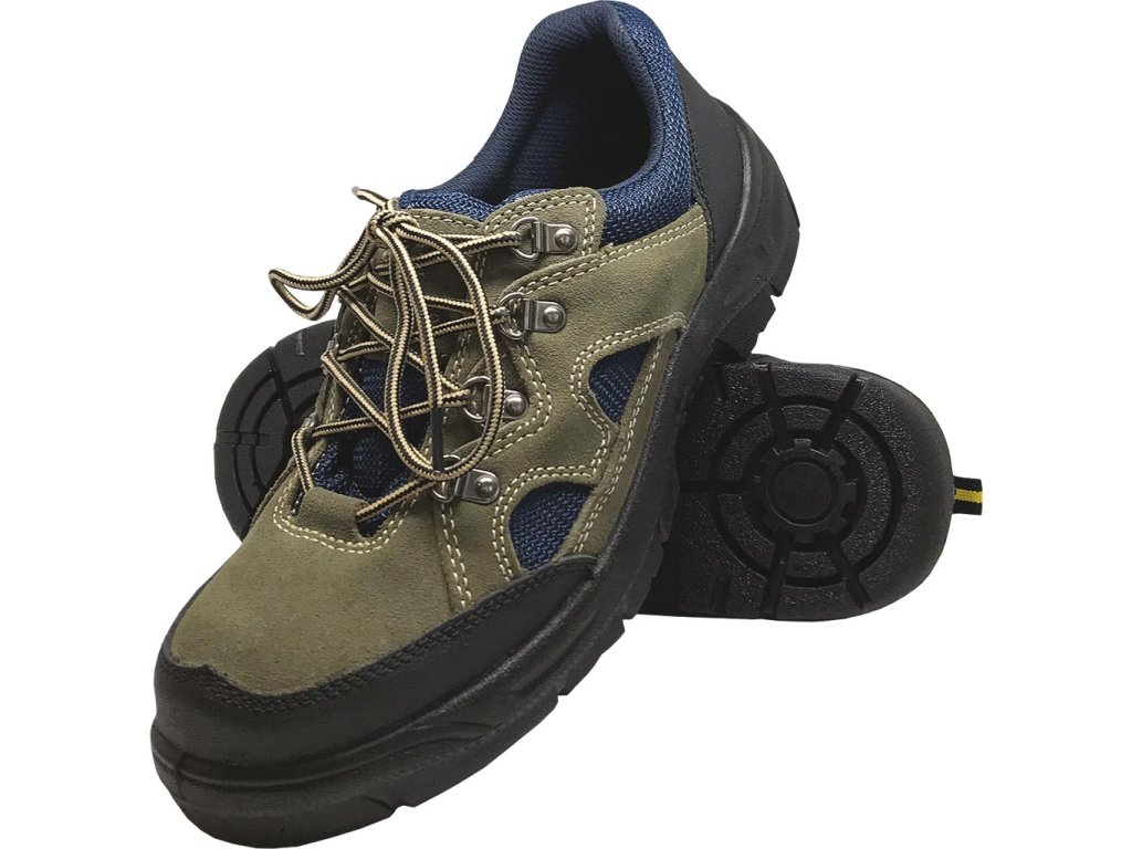 Pánske pracovné poltopánky SB LAKEREIS. - Vyrobená z hovädzej kože v kombinácii so semišom a tmavomodrou látkou, ktorá zaisťuje priedušnosť. - Nízky strih topánky, ktorý siaha nad členok. - Protišmyková podrážka z dvojitého polyuretánu. - Tlmenie nárazov pod pätou. - Oceľová špička odolná voči nárazom 200 J a tlakovým silám až 15 kN. - Vystužená hovädzou kožou na špičke a päte, vďaka čomu je obuv oveľa odolnejšia a odolnejšia voči opotrebovaniu. - Kategória SB E SRA. - Spĺňa požiadavky noriem EN20345 a EN20344.