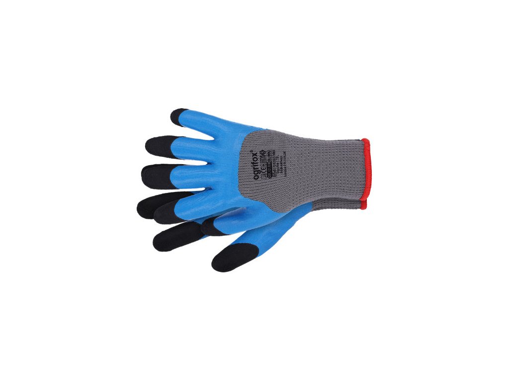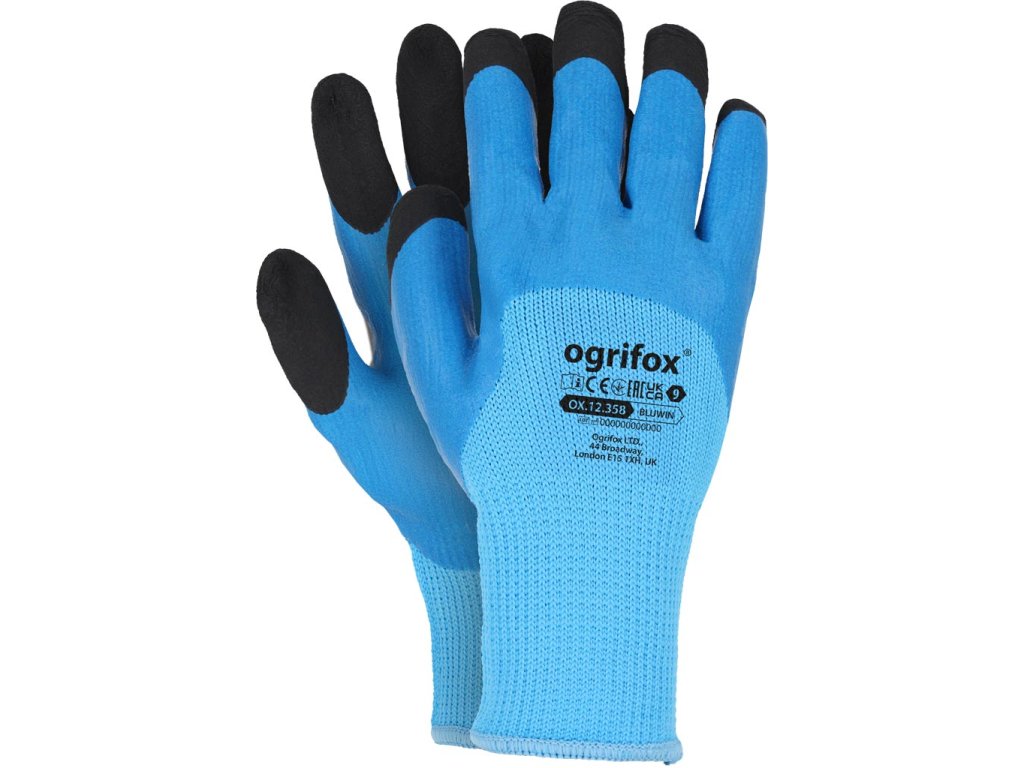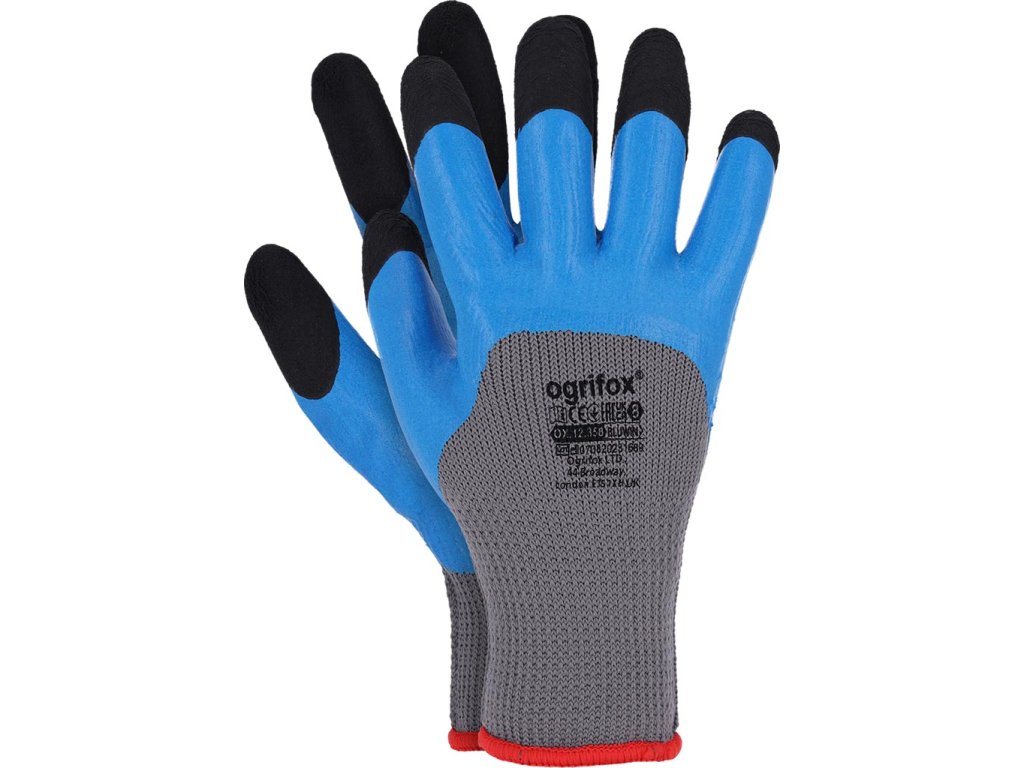 Pracovné rukavice stavbárske OGRIFOX. - 100 % polyester (10 gauge) - modrý povlak z penového latexu na rukoväti a v polovici chrbtovej časti - dodatočný čierny povlak z penového latexu na končekoch prstov - rebrované manžety - odolnosť a vysoká kvalita zaručujú spokojnosť používateľov - používajú sa v stavebníctve a doprave