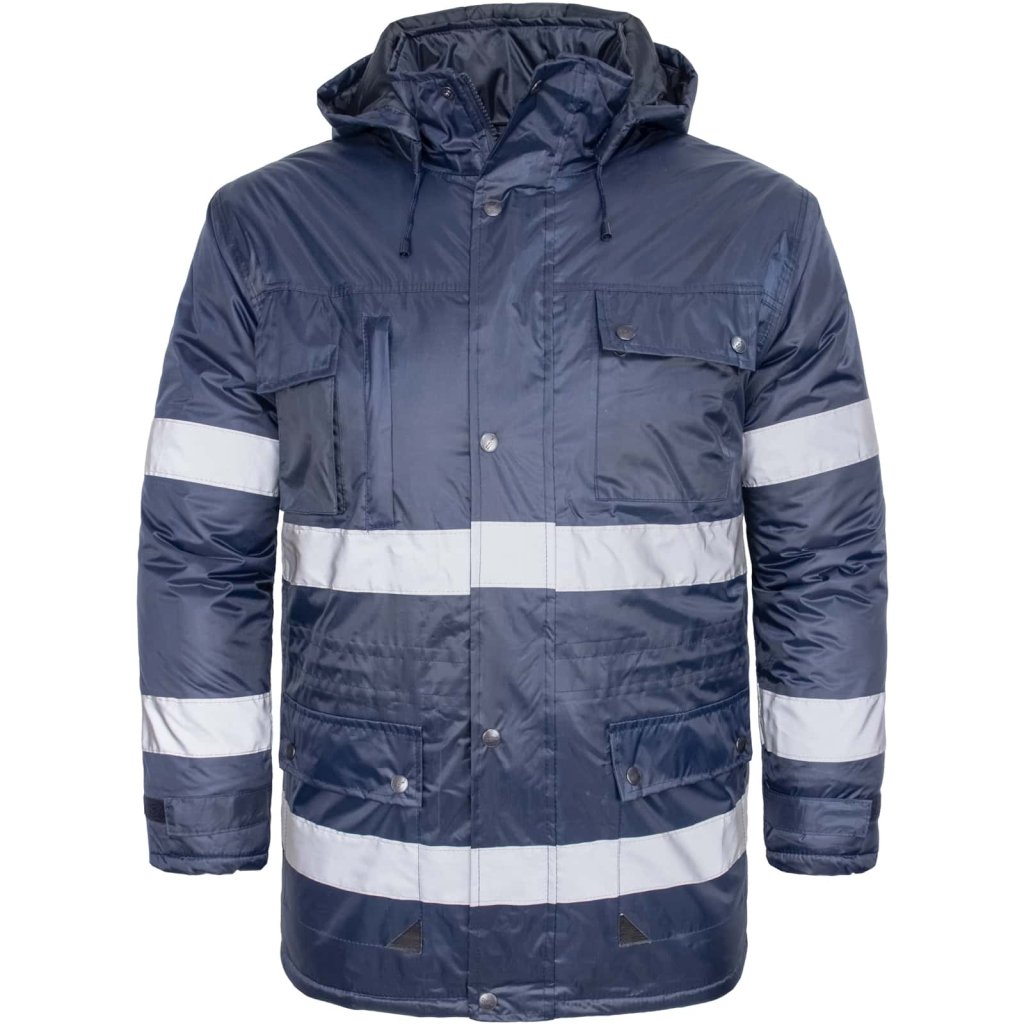 Pánska zateplená pracovná bunda. - Materiál: 100 % polyester s PVC povlakom, 190 g/m² - Výplň: 100 % polyester, 180 g/m² - Prešívaná podšívka: 100 % polyesterový taft, 55 g/m² - Zapínanie na zips s dodatočným zapínaním na patentný patent - Stojatý golier - Odnímateľná kapucňa so sťahovacími šnúrkami - Dve spodné vrecká so zapínaním na patentný patent a tri náprsné vrecká vrátane vrecka na mobilný telefón - Vnútorné vrecko - Vnútorné sťahovanie v páse pre individuálne prispôsobenie a ochranu pred vetrom - Rukávy so zapínaním na suchý zips pre nastaviteľnú šírku - Systém vetrania v podpazuší pre cirkuláciu vzduchu a pohodlie - Reflexné pruhy pre zvýšenú viditeľnosť - Ideálne pre cestných príslušníkov a orgány činné v trestnom konaní - POHODLNÝ štýl