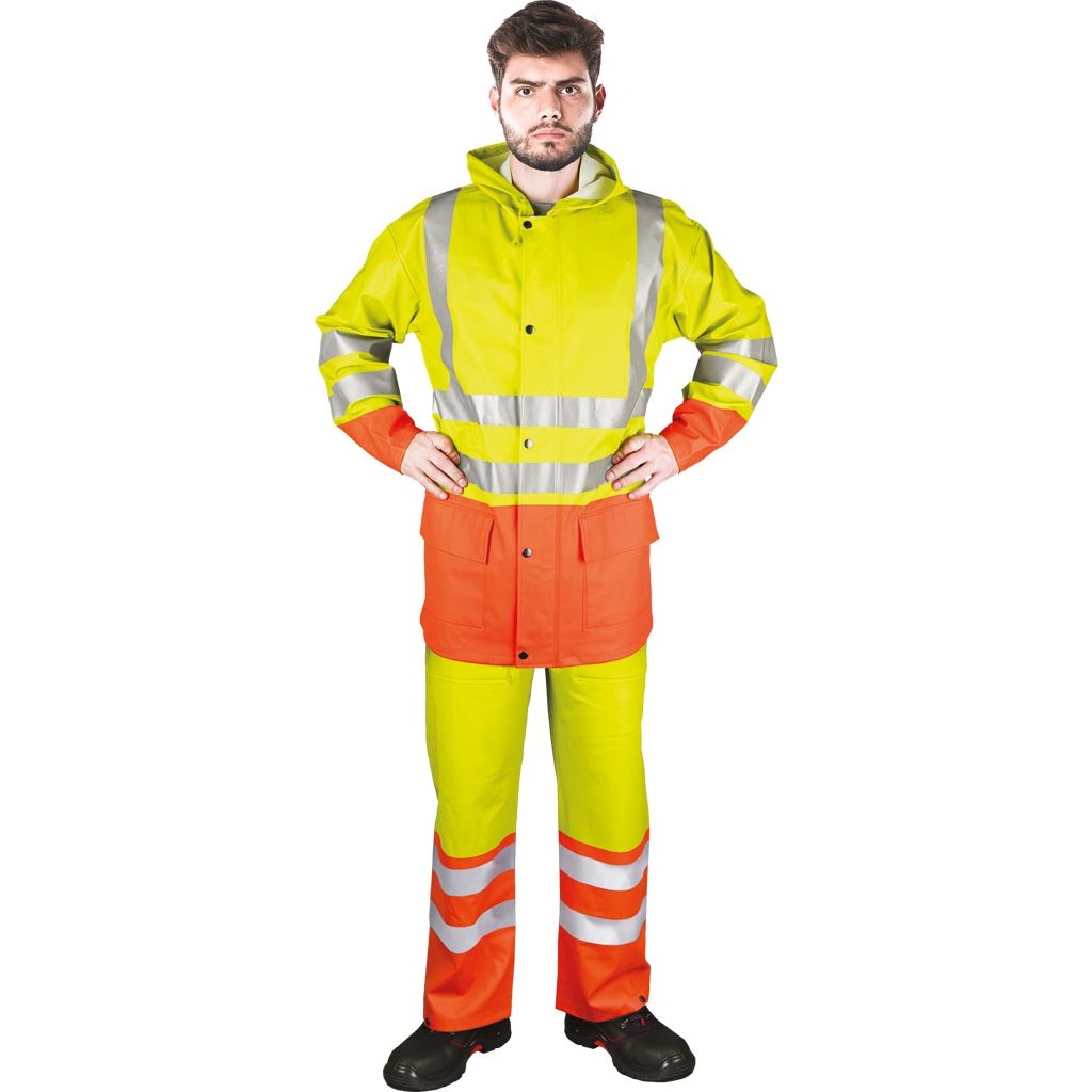 Vysokokvalitná pršiplášťová súprava 2v1 z odolného a flexibilného materiálu REIS. - Vyrobené z PU/PVC - Hrúbka: 0,50 mm - Polyesterová podšívka - flexibilná, takže neobmedzuje pohyb a poskytuje veľkú voľnosť a pohodlie počas nosenia - Bunda a montérky sú balené v taške so zapínaním na patentný cvok a ďalším vešiakom - Bunda: Zapínanie na zips s dodatočnou chlopňou na patentný cvok tesne prekrýva rozparky zipsov, aby sa zabránilo vniknutiu dažďa a vetra. Kapucňa so sťahovacími šnúrkami. Dve veľké vrecká v spodnej časti bundy s chlopňami, ktoré zabraňujú vniknutiu vody. Vo vnútri rebrované manžety poskytujú vynikajúcu ochranu pred vetrom. Sťahovacia šnúrka v spodnej časti bundy. Vetracie systémy na chrbte a pod pazuchami zabezpečujú nevyhnutnú cirkuláciu vzduchu. - Nohavice: Dĺžka sa dá nastaviť trakmi. Tri vrecká. Spodné časti nohavíc sa dajú zúžiť pomocou patentných cvokov pre lepšiu ochranu pred vetrom. Reflexné pásy v spodnej časti nohavíc a v páse. - ideálne do nepriaznivého počasia - popruhy spĺňajú normy EN ISO 20471