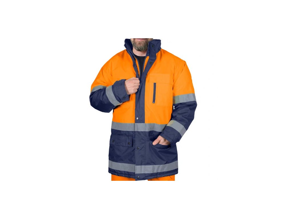 Reflexná pracovná bunda predĺžená REIS. - Materiál: 100% 300D 190g/m² s polyuretánovým povlakom, 100% polyester Oxford, výplň 160g/m² - Prešívaná podšívka: 100% polyesterový taft, 55g/m² - Zapínanie na obojsmerný zips s dodatočným patentným gombíkom - Stojatý golier - Kapucňa so sťahovacími šnúrkami, ktoré sa dajú zrolovať do goliera a zapnúť suchým zipsom - Dve spodné vrecká a vrecko na mobilný telefón na hrudi - Skryté vrecko na zips pod klopou - Vnútorné vrecko so zapínaním na suchý zips - Rukávy s elastickými manžetami - Fluorescenčná tkanina a reflexné pruhy pre zvýšenú viditeľnosť - Ideálne pre cestných príslušníkov a iných príslušníkov orgánov činných v trestnom konaní - POHODLNÝ štýl