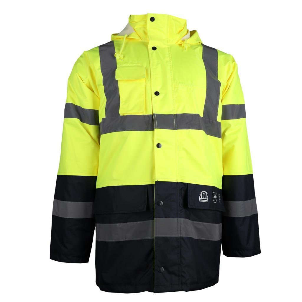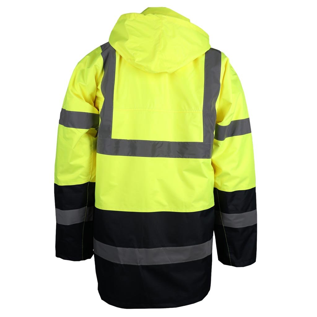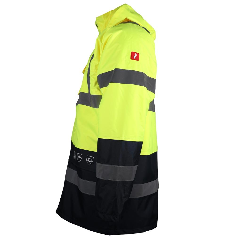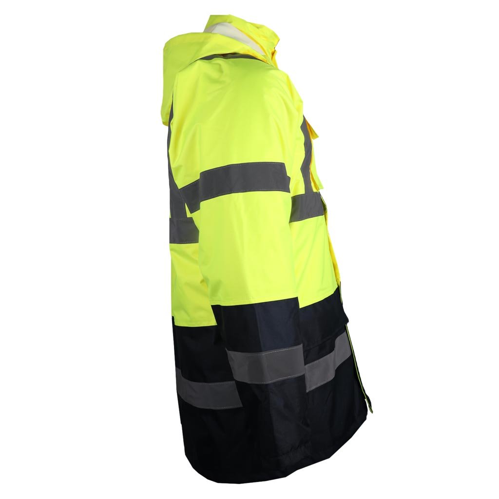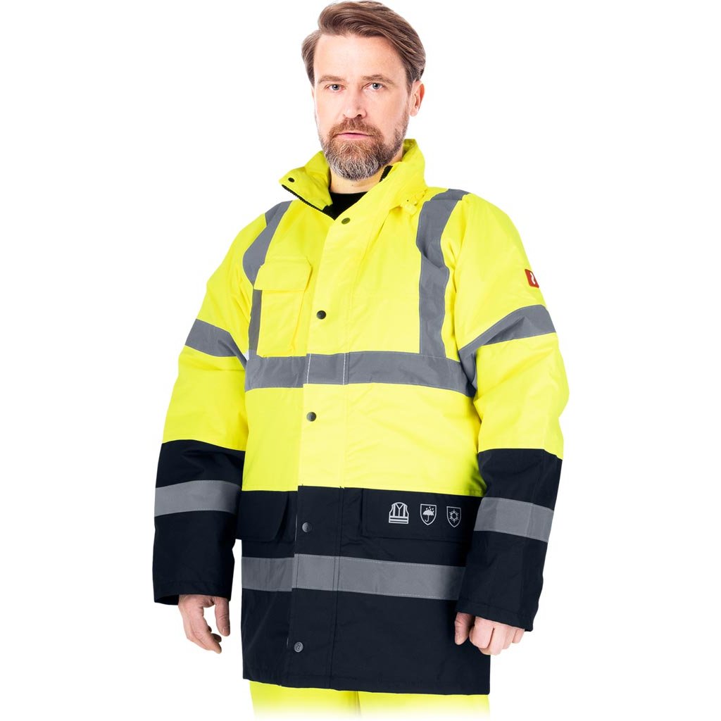 Reflexná zateplená bunda predĺžená REIS. - Materiál: 100% 300D 190g/m² s polyuretánovým povlakom, 100% polyester Oxford, výplň 160g/m² - Prešívaná podšívka: 100% polyesterový taft, 55g/m² - Zapínanie na obojsmerný zips s dodatočným patentným gombíkom - Stojatý golier - Kapucňa so sťahovacími šnúrkami, ktoré sa dajú zrolovať do goliera a zapnúť suchým zipsom - Dve spodné vrecká a vrecko na mobilný telefón na hrudi - Skryté vrecko na zips pod klopou - Vnútorné vrecko so zapínaním na suchý zips - Rukávy s elastickými manžetami - Fluorescenčná tkanina a reflexné pruhy pre zvýšenú viditeľnosť - Ideálne pre cestných príslušníkov a iných príslušníkov orgánov činných v trestnom konaní - POHODLNÝ štýl