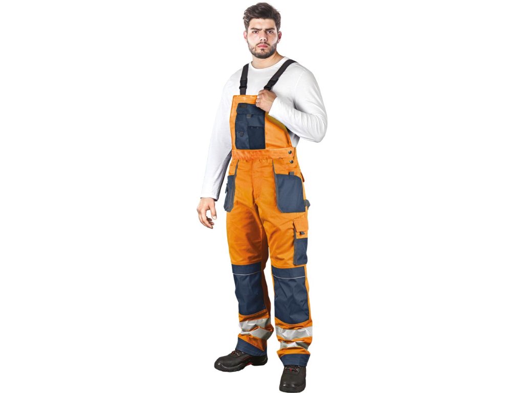 Reflexné pracovné nohavice na traky FORMEN značky L.HOLLMAN pre mužov - hlavný materiál: látka: 80% polyester, 20% bavlna (farby CSB a CGS: 100% polyester) s gramážou 270 g/m2 - výplne z kontrastnej 100% polyesterovej oxfordskej látky - dve zadné vrecká a dve dvojité bočné vrecká, z ktorých jedno je so zapínaním na suchý zips - jedno vrecko na nohavici so zapínaním na suchý zips a ďalšími vreckami na príslušenstvo, jedno pozdĺžne bočné vrecko a jedno na hrudi s vreckami na telefón a príslušenstvo - hrot na pripevnenie kľúčov - pútka na pripevnenie ďalšieho príslušenstva - nastaviteľný pás a dĺžka s trakmi - guma v zadnej časti pre väčšiu voľnosť pohybu - vrecká na chrániče kolien na kolenách - dodatočné materiálové výstuže na vreckách, kolenách a spodnej časti nohavíc - reflexné pruhy pre lepšiu viditeľnosť - testované na obsah škodlivých látok v súlade s normami OEKO-TEX® Standard 100