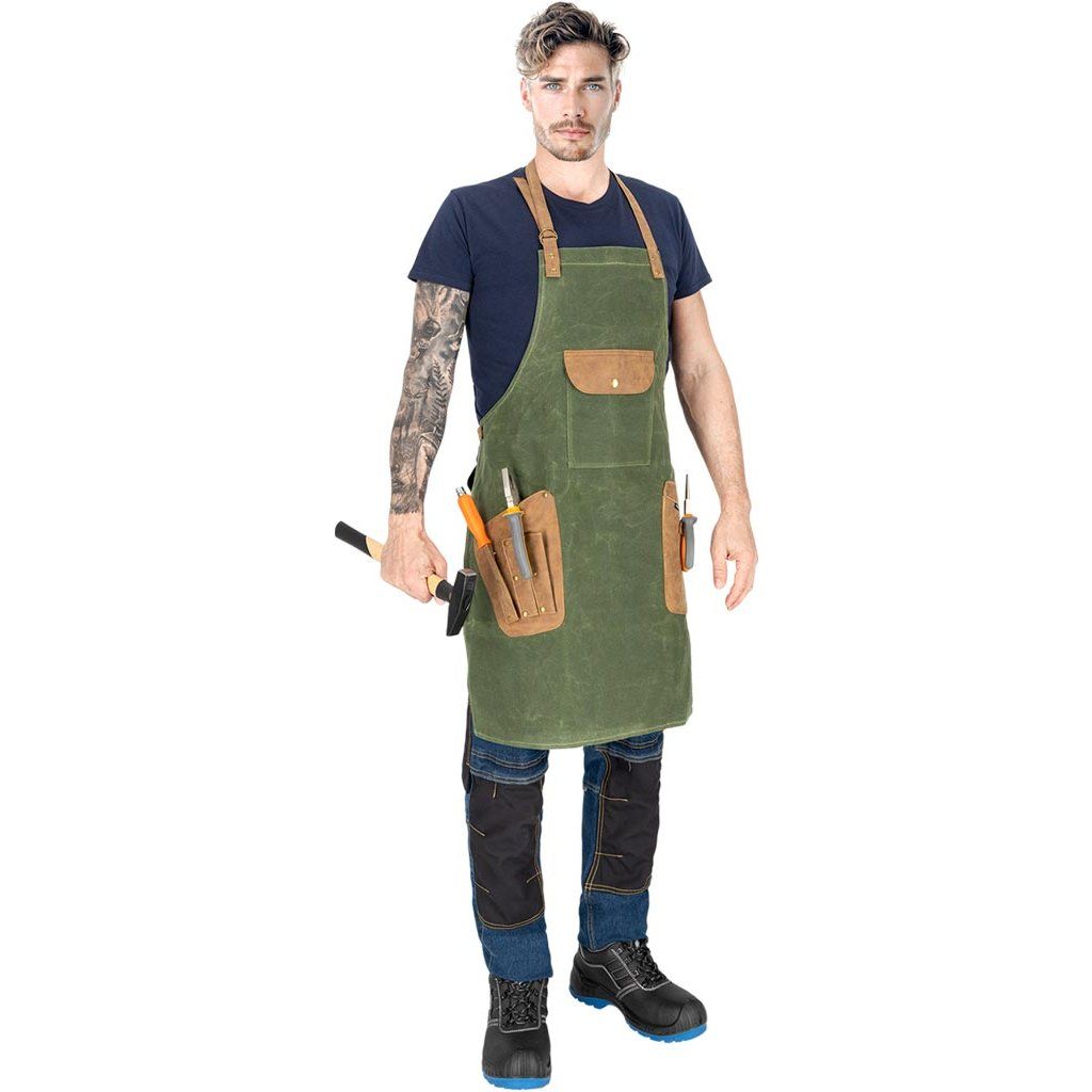 Pánska remeselnícka zástera REIS. - Voskovaná plátenná tkanina: 70 % bavlna, 30 % polyester - Vložky z PU syntetickej kože - Zapínanie na krk s nastaviteľnou prackou - Zaväzovanie vzadu na opasok pre lepšie prispôsobenie - Dve spodné vrecká s priehradkami a pútkom na kladivo a jedno náprsné vrecko so zapínaním na patentný cvok - Určené pre remeselníkov