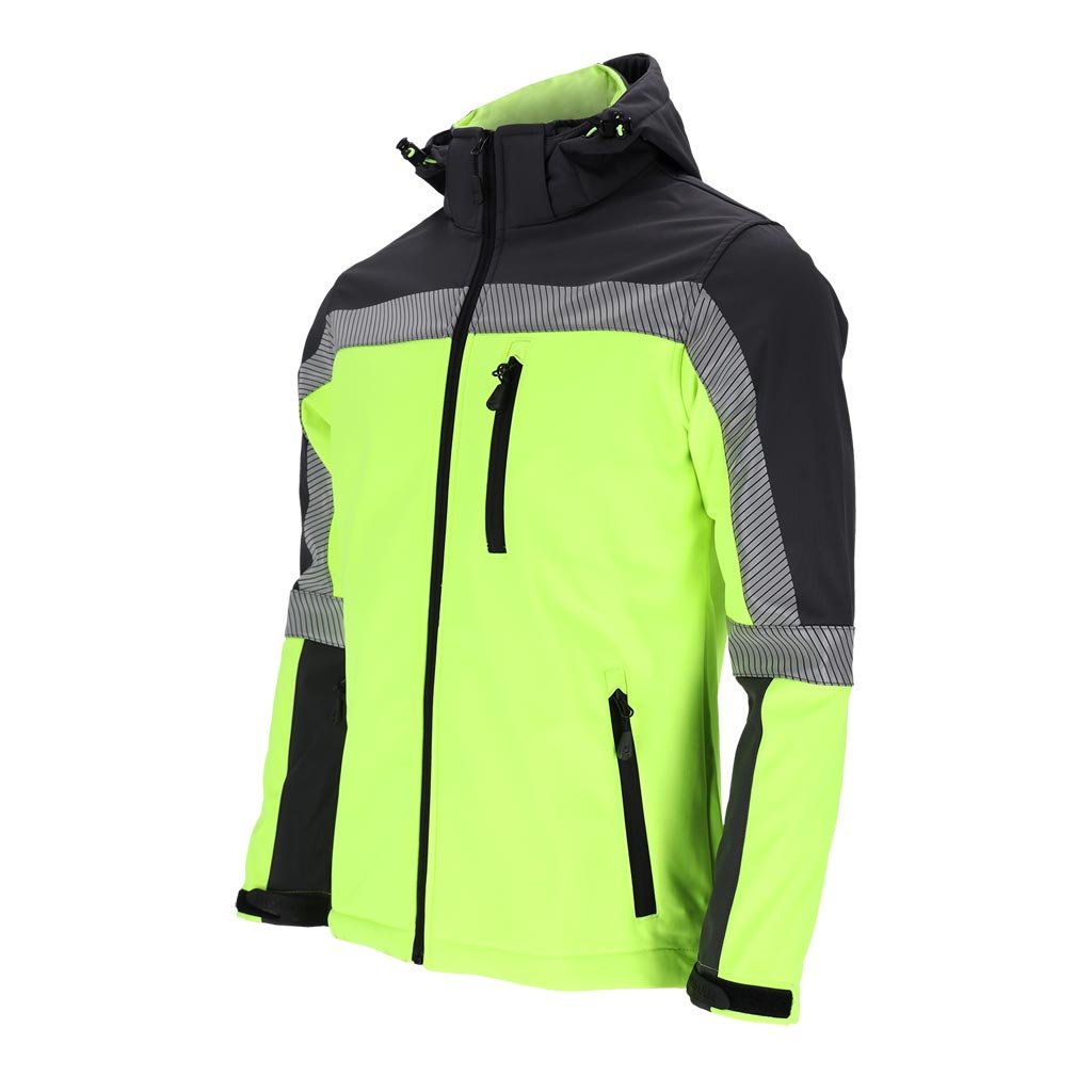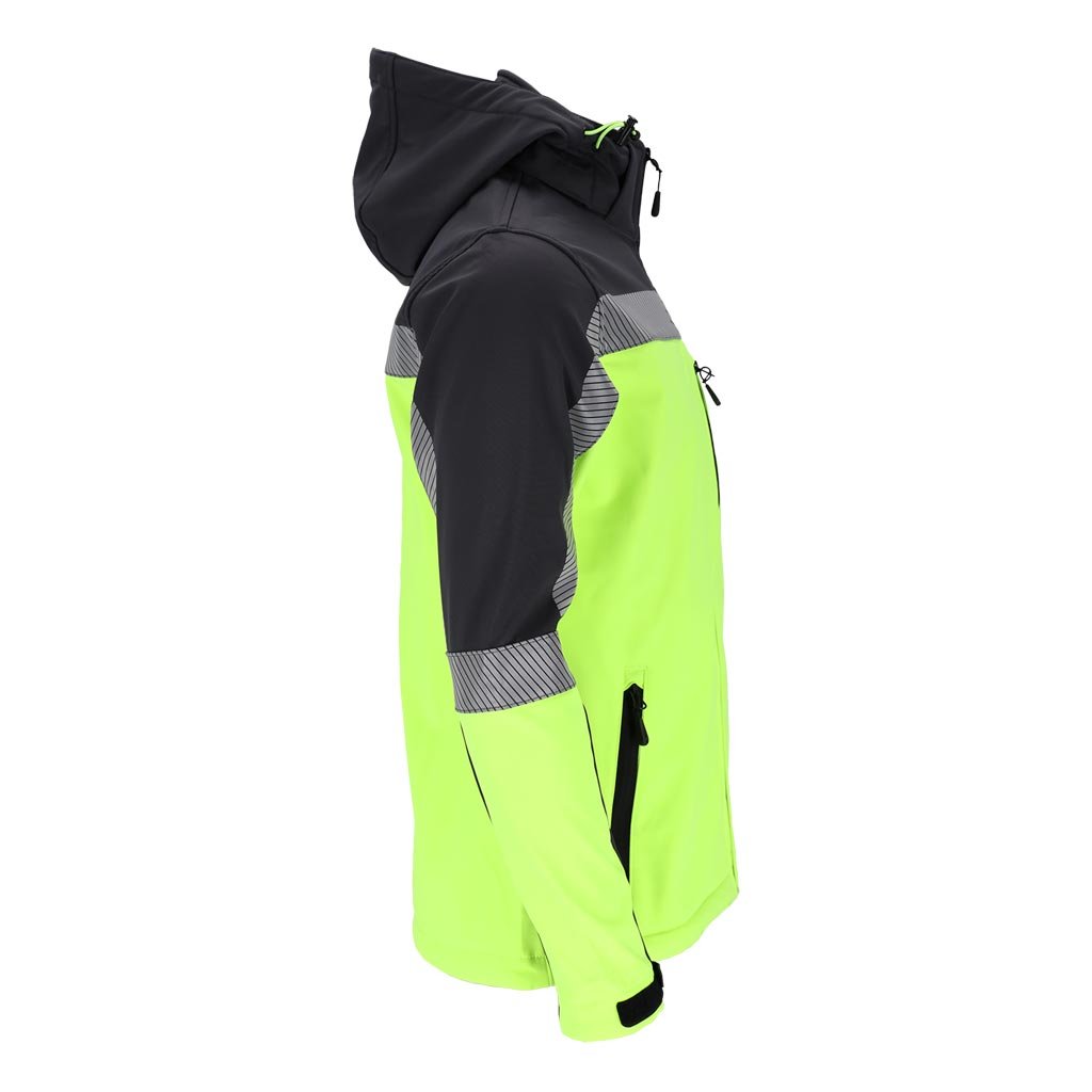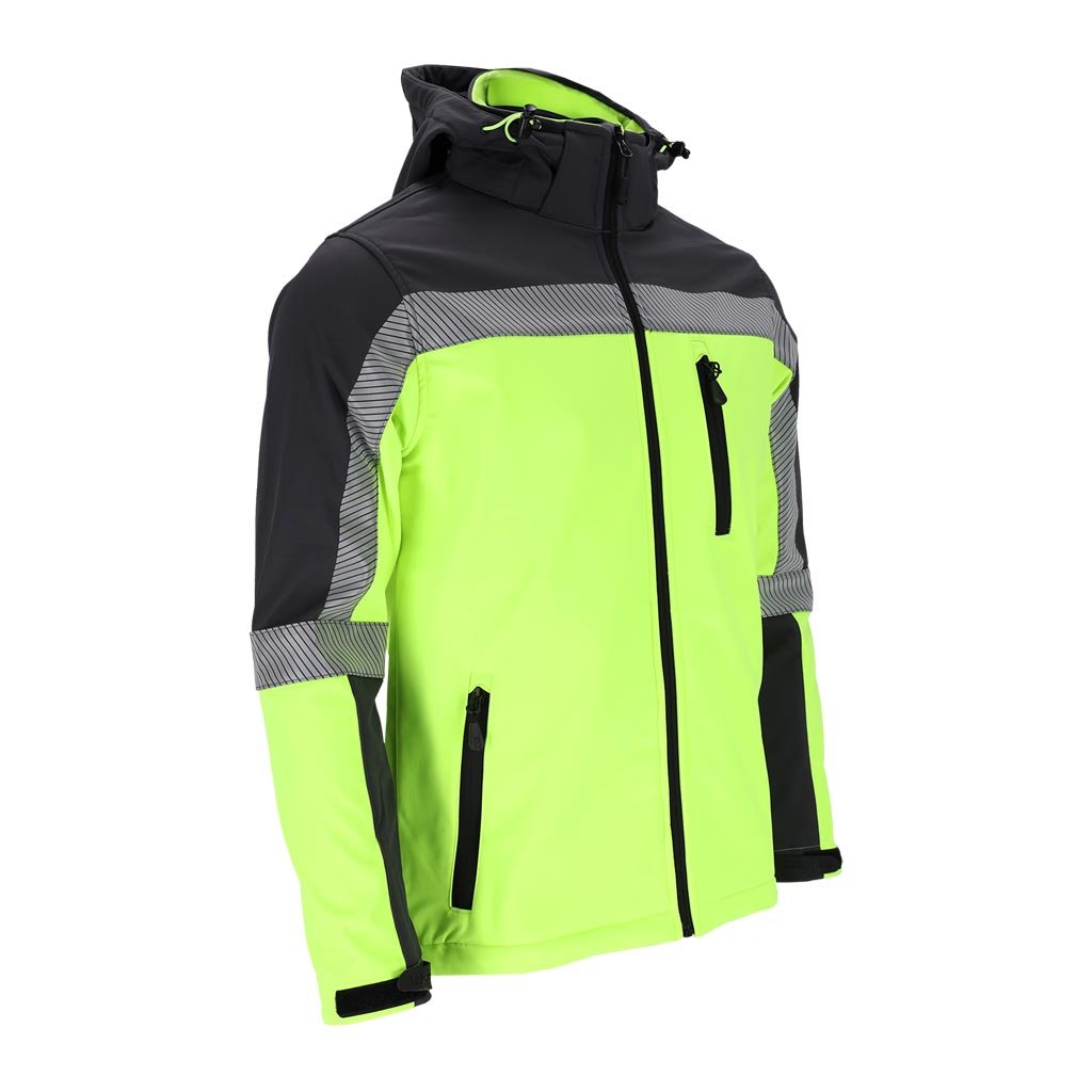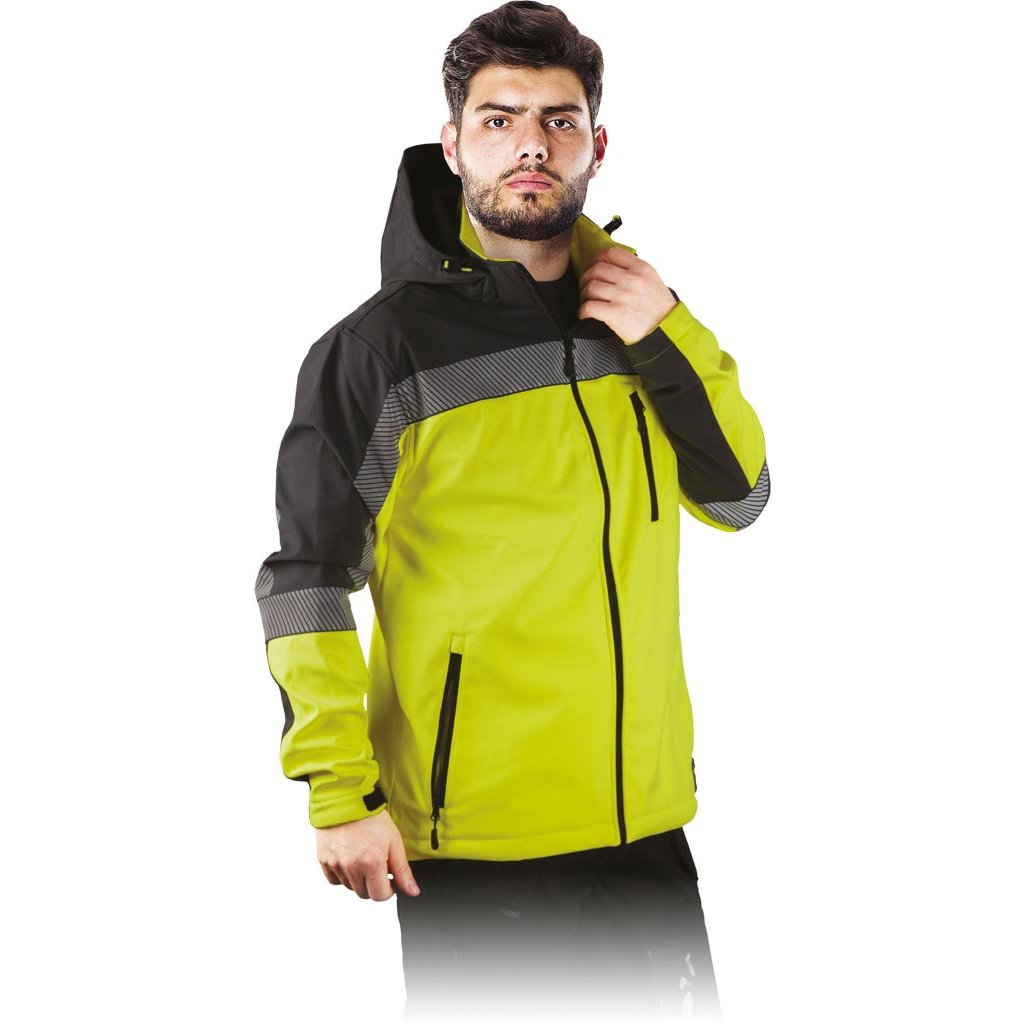 Softshellová pracovná bunda pre mužov ideálna do nepriaznivých pracovných podmienok. - Trojvrstvový softshellová tkanina: 96 % polyester, 4 % elastan, TPU membrána, 100 % polyesterový fleece - gramáž 280 g/m² - materiál SOFTSHELL - chráni pred dažďom a vetrom a zároveň umožňuje pokožke dýchať - zapínanie na zips - odnímateľná kapucňa - dve spodné vrecká a náprsné vrecko so zipsami - zapínanie na suchý zips - sťahovacie šnúrky v spodnej časti bundy - reflexné prvky pre lepšiu bezpečnosť