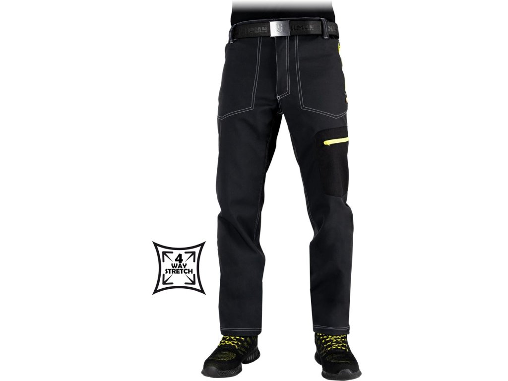 Pánske sofsthellové elastické pracovné nohavice do pása značky L.HOLLMAN. - Hlavný materiál: trojvrstvová softshellová tkanina so 4-smerným strečom 94 % polyester, 6 % elastan, TPU membrána, 100 % polyesterový fleece, 300 g/m² - Vložky: 100 % nylonová oxfordská tkanina, 200 g/m² - SOFTSHELL materiál - chráni pred dažďom a vetrom a zároveň umožňuje pokožke dýchať - 4-smerný streč - materiál, ktorý sa naťahuje všetkými smermi - Zapínanie na gombík a zips - Dve bočné vrecká so zipsom - Vrecko na zips na nohavici - Elastický pás po stranách pre lepšie prispôsobenie - Strih: REGULAR
