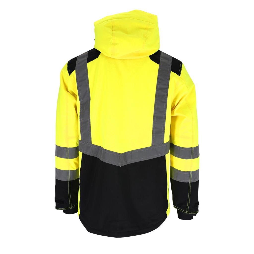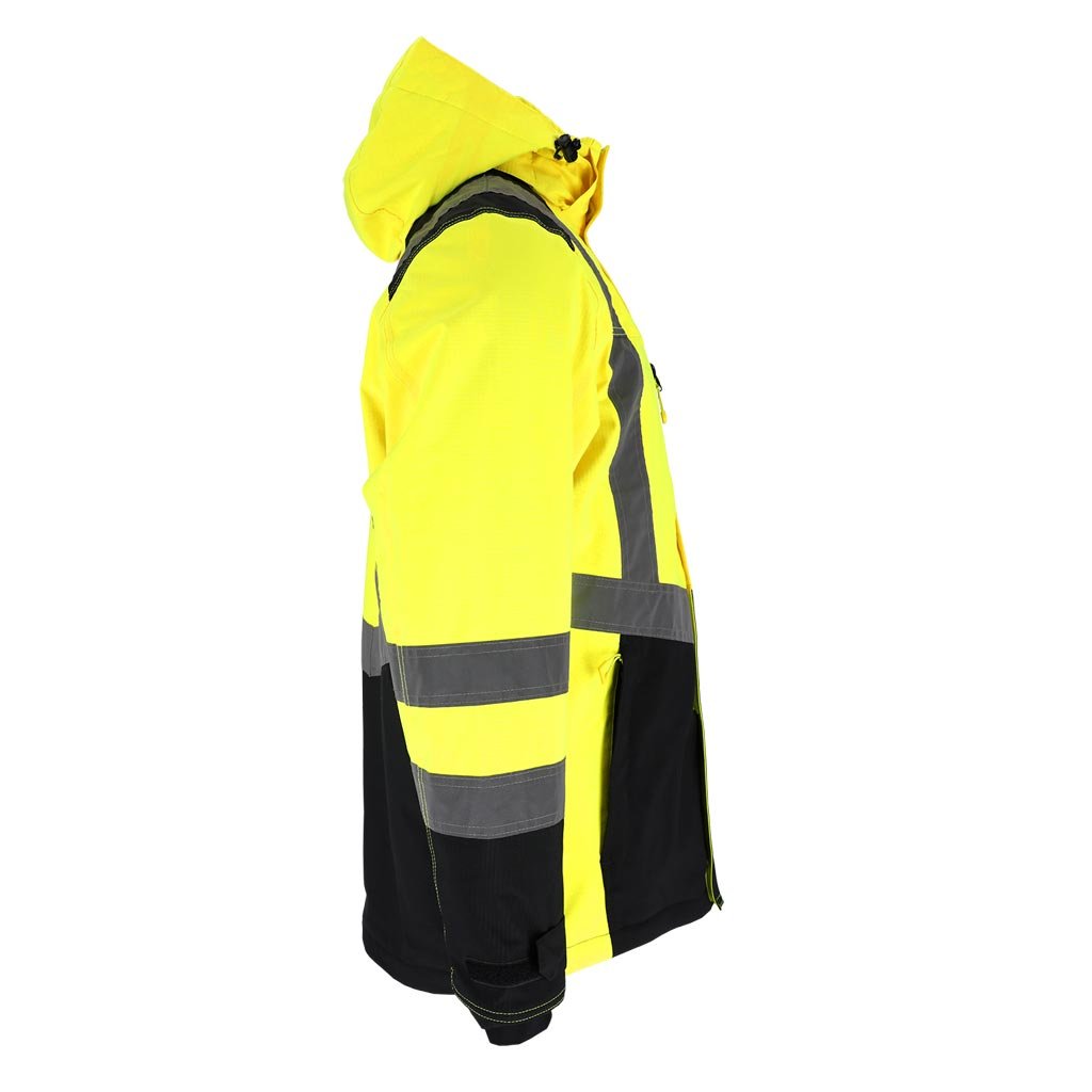 Strečová zateplená pracovná a reflexná bunda L.HOLLMAN. - obojsmerne strečová tkanina s rip-stop väzbou: 100% polyester potiahnutý TPU membránou, gramáž 170 g/m2 - podšívka: 100% polyester, gramáž 120 g/m2 (telo) a 100% polyester, gramáž 100 g/m2 (rukávy) - prešívaná podšívka: 100% polyesterový taft, gramáž 55 g/m2 - obojsmerne strečová - materiál, ktorý sa naťahuje v jednej rovine - rip-stop tkanina - chráni pred roztrhnutím pri zachytení o vyčnievajúci predmet - zapínanie na zips s dodatočným suchým zipsom - stojatý golier - odnímateľná kapucňa so sťahovacími šnúrkami a dodatočným suchým zipsom pre lepšiu ochranu hlavy pred chladom - dve vrecká v spodnej časti zapínané na zips, dve na hrudi, vrátane jedného zapínaného na zips a druhého na suchý zips a dodatočného vrecka na preukaz totožnosti - vnútorné vrecko so zapínaním na suchý zips - rukávy so zapínaním na suchý zips pre nastavenie šírky - spodná časť bundy sa dá stiahnuť zvnútra pomocou sťahovacích šnúrok - fluorescenčná tkanina a reflexné pruhy pre zvýšenú viditeľnosť - strih: REGULAR