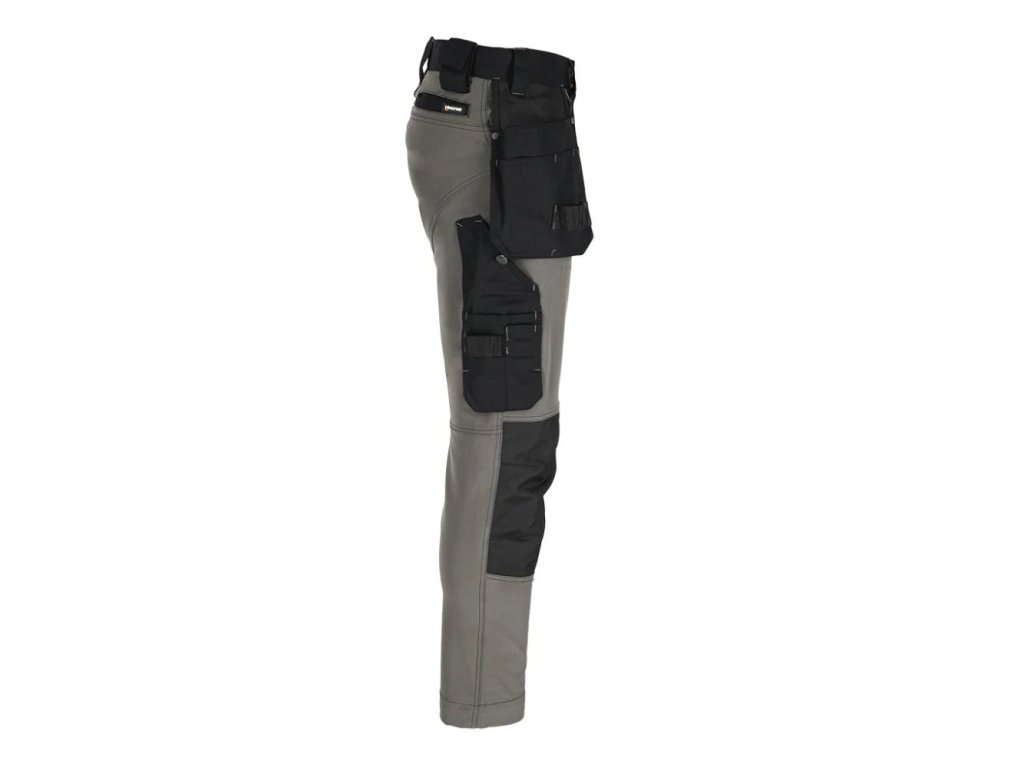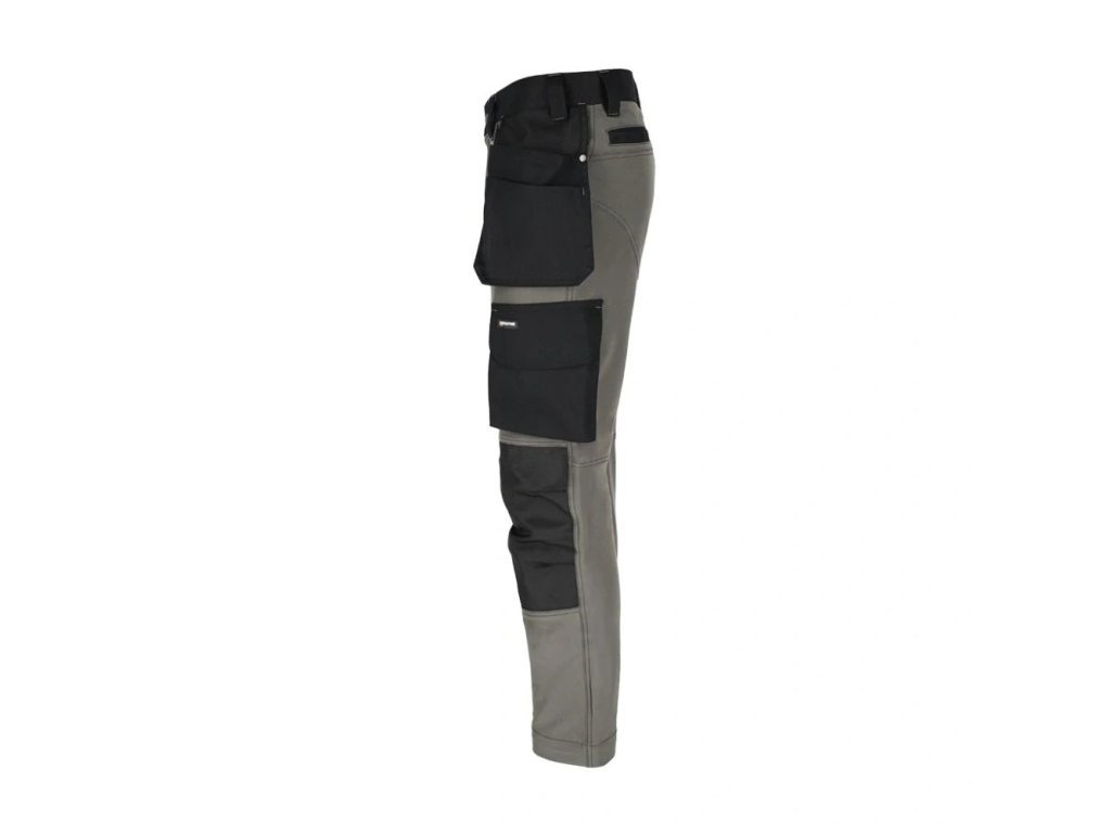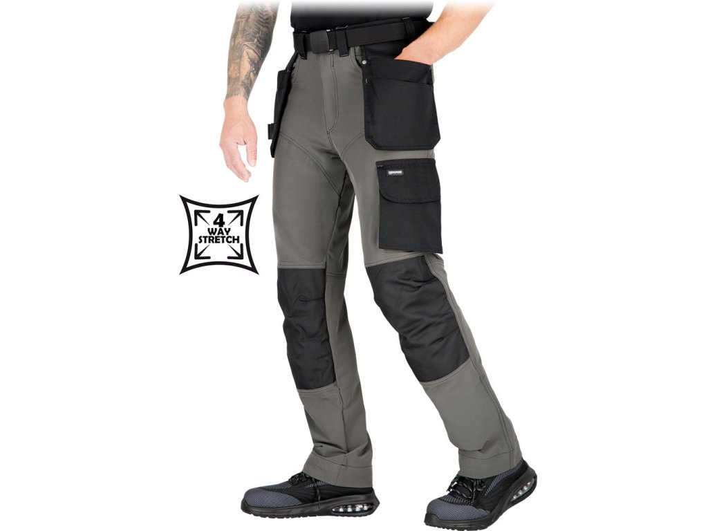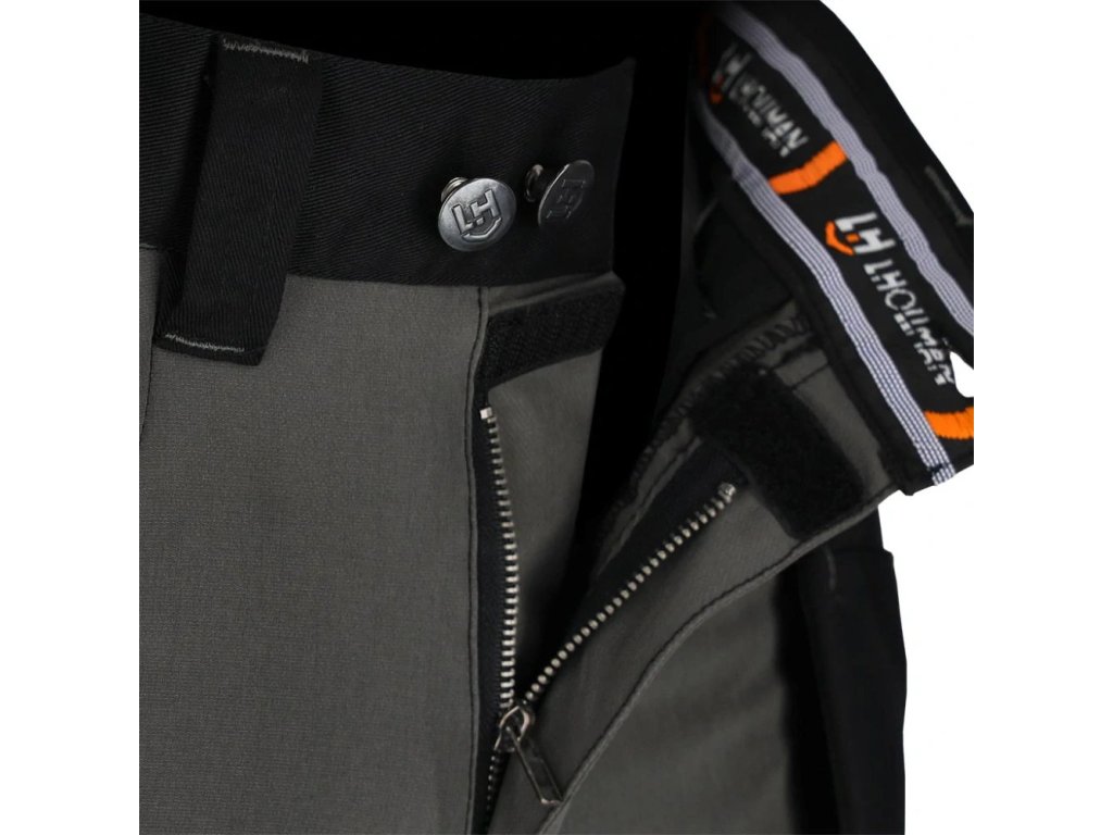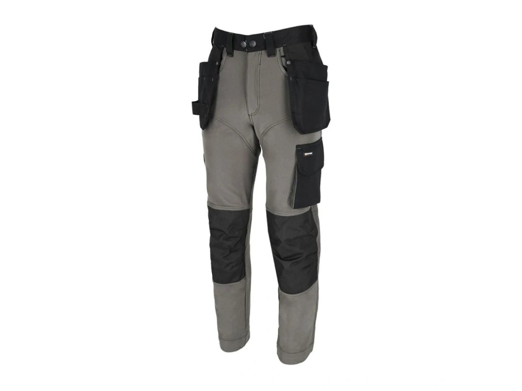 Strečové pracovné montérky do pása značky L.HOLLMAN. - hlavný materiál: 4-cestná strečová tkanina 90% polyester, 10% elastan, 240 g/m2 - výplne na kolenách a zadnej strane vreciek na náradie: 100% polyesterový žakárový Oxford 300D, 310 g/m2 - výplne na páse a vreckách: keprová tkanina 65% polyester, 35% bavlna, 270 g/m2 - 4-cestná strečová tkanina - materiál, ktorý sa naťahuje všetkými smermi - zapínanie na gombíky, suchý zips a zips - silikón v páse proti šmýkaniu - dve bočné vrecká, dve dvojité vrecká na náradie, z toho jedno s priehradkami a dve zadné - vrecká na nohaviciach, z toho jedno na suchý zips a jedno pozdĺžne s priehradkami - tvarované kolená - prídavné pútko na príslušenstvo zapínané na suchý zips - koniec na pripevnenie kľúčov - držiak na kladivo na pravej nohavici - určené pre montérov - strih: REGULAR