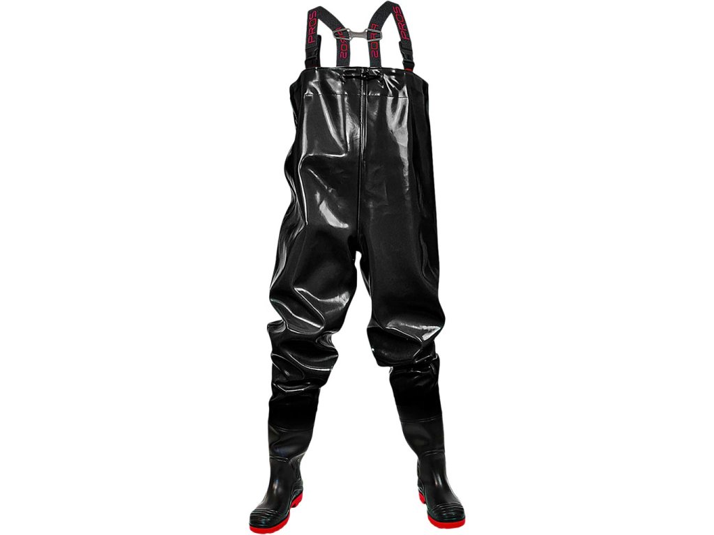 Vodeodolné pracovná súprava na traky s cižmami CHEST WADERS PROS. Odolná guma Guma novej generácie, bezúdržbová - Hmotnosť: 1000 g/m² - Vysoká odolnosť voči mechanickému poškodeniu - Trvalo zvarené topánky zabraňujú pošmyknutiu na oceľových povrchoch potiahnutých glycerolom a keramických povrchoch potiahnutých roztokom laurylsulfátu sodného (typ ochrany OB FO E SRC) - Nastaviteľné traky z elastickej, širokej gumy - Odolné, obojstranne zvarené švy