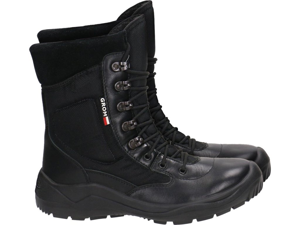 Vojenské topánky GROM 1138 FAGUM STOMIL - kožené, zvršok z celozrnnej kože v kombinácii s materiálom Cordura - ideálne pre armádu, políciu, bezpečnostné agentúry, skauting, prežitie a každodenné použitie pre civilistov - zosilnená podrážka, profilovaná podšívka, 3D podšívka s vzdušným priestorom, podrážka PU/PU Techwork 5 - podrážka nereaguje s olejmi, tukmi ani zriedenými kyselinami a zásadami - systém šnurovania s háčikmi, vysoko nasadený jazyk, ktorý zabraňuje prenikaniu vody do vnútra topánky v dôsledku striekania