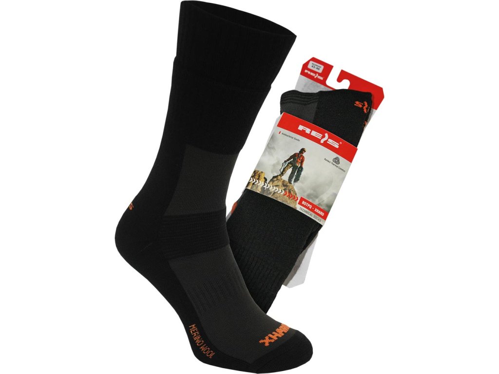 Vysoké termo ponožky REIS do práce aj na každodenné použitie. - 35 % merino vlna, 35 % polyakryl, 15 % Coolmax®, 13 % Prolen Siltex, 2 % Lycra - Priadza Prolen Siltex zabraňuje nepríjemným zápachom a zaisťuje maximálnu hygienu - Merino vlna zaručuje vynikajúcu tepelnú izoláciu a dlhotrvajúci pocit sucha - Dvojitá manžeta bez tlaku zaisťuje pohodlie - Vetracie kanály podporujú optimálnu výmenu vzduchu odvádzaním vlhkosti a prebytočného vzduchu - Zosilnená ochrana chodidla a Achillovej šľachy - Tlmenie chodidla v obuvi (froté vrstva) - Päta typu Y: vhodne tvarovaný úplet sa dokonale prispôsobí chodidlu a stabilizuje ho - Elastický pás v strede chodidla zabraňuje šmýkaniu a krúteniu ponožky - Plochý šev v mieste spojenia prstov - Zabraňuje oderom nad prstami, a to aj v extrémnych podmienkach