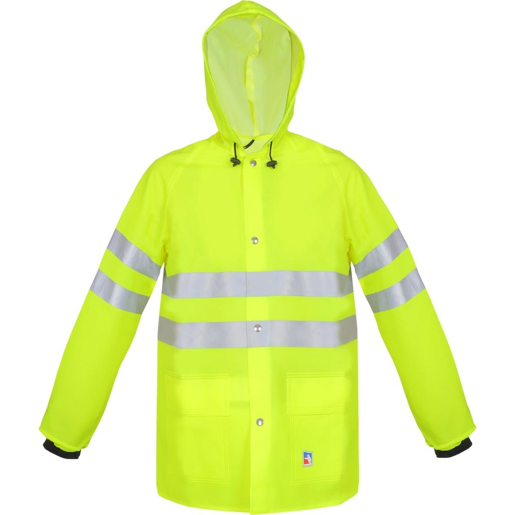 Vysoko reflexný pršiplášť WADERS. - Vyrobená z materiálu DynaFlex odolného voči silnému dažďu, vetru a mechanickému poškodeniu. - Spĺňa požiadavky na osobnú ochranu kategórie II, trieda viditeľnosti 2. - Zapína sa na kovové patentné gombíky. - Trvalo pripevnená kapucňa. - Dve vrecká v páse s klopami. - Elastické manžety zabraňujú vniknutiu vody dovnútra rukáva. - Vybavená dvoma reflexnými pruhmi 3M po obvode bundy a rukáva. - Metóda spájania materiálov: vysokofrekvenčné zváranie, ktoré zabezpečuje 100 % tesnosť švov. - Určená pre stavebný priemysel, pracovníkov na cestách a diaľniciach, pracovníkov letísk a riadenie dopravy.