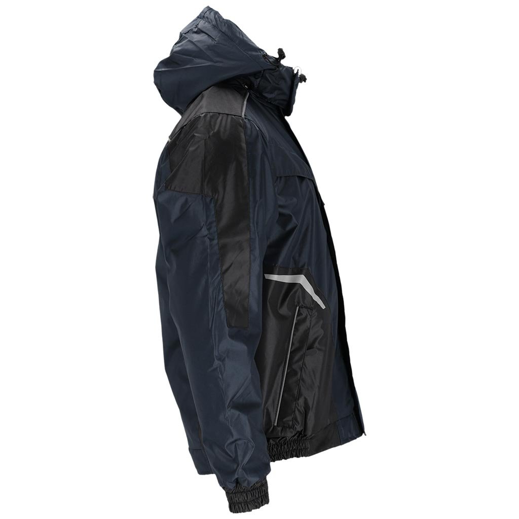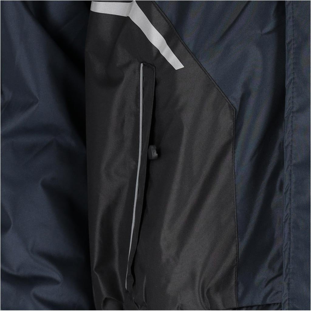 Pánska zateplená pracovná bunda. - Materiál: 100 % polyester s polyuretánovou povrchovou úpravou 150 g/m² - Výplň: 100 % polyester 180 g/m² - Podšívka: vrchný flís (100 % polyester) 280 g/m², spodná časť a rukávy z prešívaného polyesteru 190T s hustotou 85 g/m² - Zapínanie na zips s dodatočným zapínaním na suchý zips - Stojatý golier - Odnímateľná kapucňa so sťahovacími šnúrkami a dodatočným zapínaním na suchý zips pre lepšiu ochranu hlavy pred chladom - Dve spodné a dve náprsné vrecká so zipsami - Vnútorné vrecko so zapínaním na suchý zips - Rukávy s elastickými manžetami vpredu na nastavenie šírky - Elastické manžety po stranách - Reflexné prvky