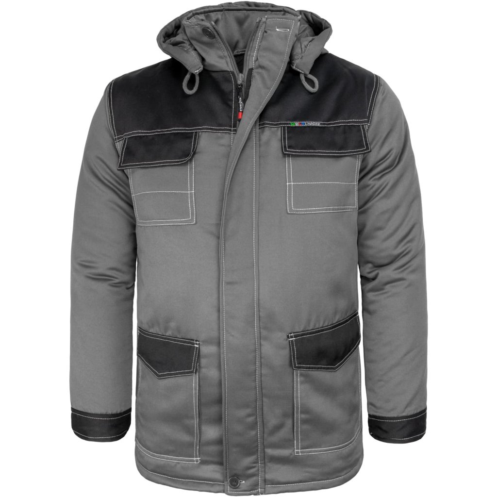 Pánska zateplená pracovná bunda. - Materiál: 65 % polyester, 35 % bavlna, 250 g/m² - Výplň: 100 % polyester, 180 g/m² - Prešívaná podšívka: 100 % polyester taft 190T, 50 g/m² - Zapínanie na zips s dodatočným zapínaním na suchý zips a gombík - Stojatý golier - Odnímateľná kapucňa so sťahovacími šnúrkami - Dve spodné vrecká a dve náprsné vrecká so zapínaním na suchý zips