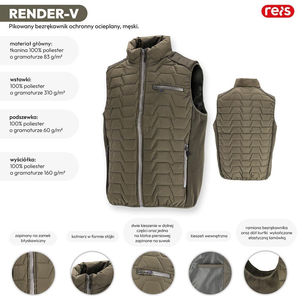 Pánska zateplená prešívaná pracovná vesta REIS - Hlavný materiál: 100% polyester, 83 g/m² - Vložky: 100% polyester, 310 g/m² - Výplň: 100% polyester, 160 g/m² - Podšívka: 100% polyester, 60 g/m² - Zapínanie na zips - Stojáček - Dve spodné vrecká a jedno náprsné vrecko so zipsom - Vnútorné vrecko - Elastický lem na ramenách a v spodnej časti vesty