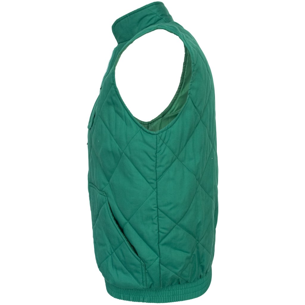 Zateplená prešívaná pracovná vesta REIS. - Materiál: 65 % polyester, 35 % bavlna, 150 g/m² - Výplň: 100 % polyester, 160 – 180 g/m² - Podšívka: 100 % polyester, 60 g/m² - Zapínanie na zips - Stojatý golier - Dve spodné vrecká a jedno náprsné vrecko na mobilný telefón - Rebrovaný lem