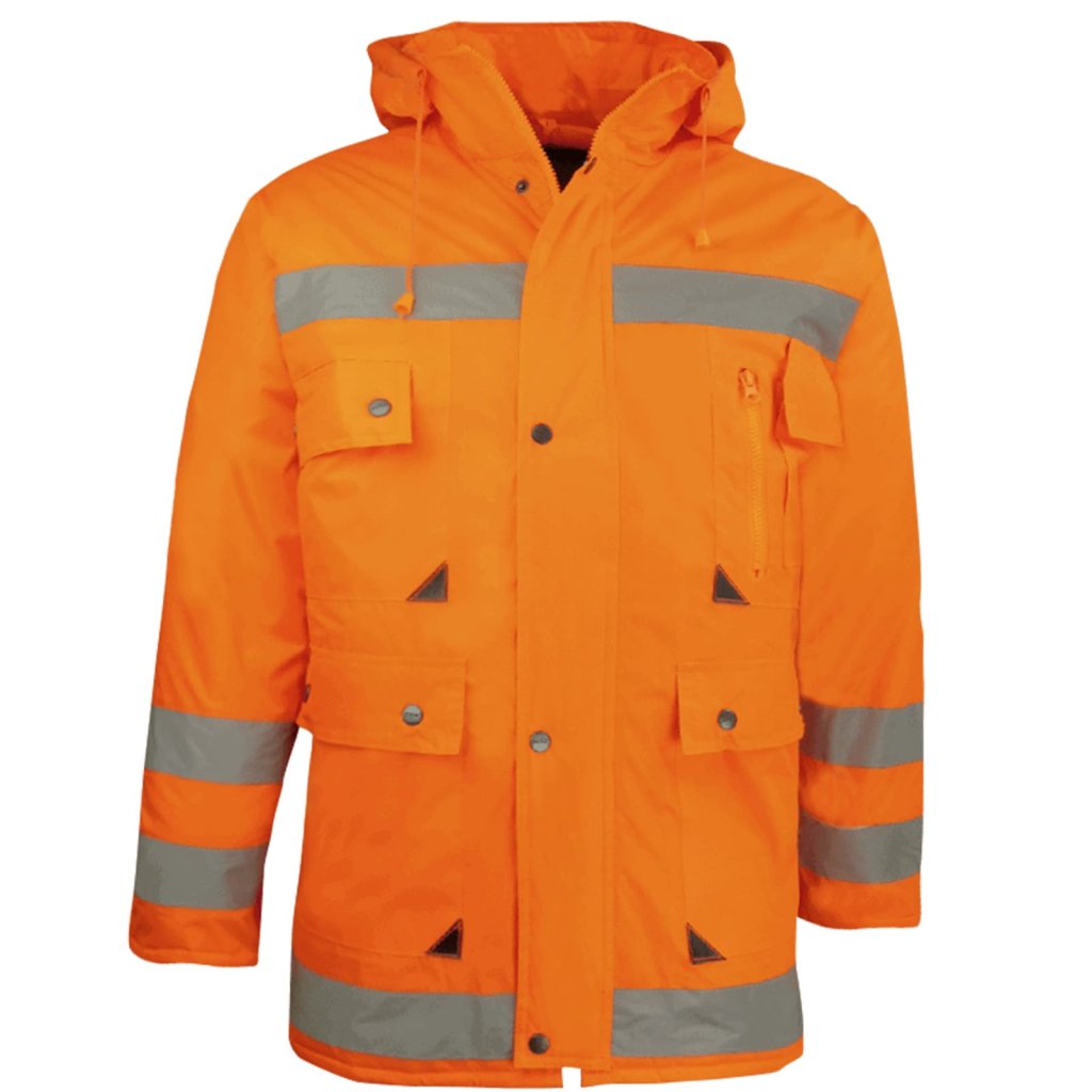 Zimná bunda s reflexnými pruhmi, ideálna pre cestných robotníkov. - Materiál: 100% polyester s PVC povlakom, 180 g/m² - Výplň: 100% polyester, 160 g/m² - Podšívka: 100% nylonový taft, 53 g/m² - Zapínanie na zips s dodatočným zapínaním na patentný cvok - Kapucňa na zips - Tri vrecká zvonku - Ďalšie malé vrecko vo vnútri - Vonkajšia časť bundy je vyrobená z nylonu a dodatočne potiahnutá PVC, čo chráni pred prenikaním vody v daždi - Sťahovacia šnúrka v zadnej časti bundy okolo pása zaisťuje priliehavé nosenieDodatočné parametre