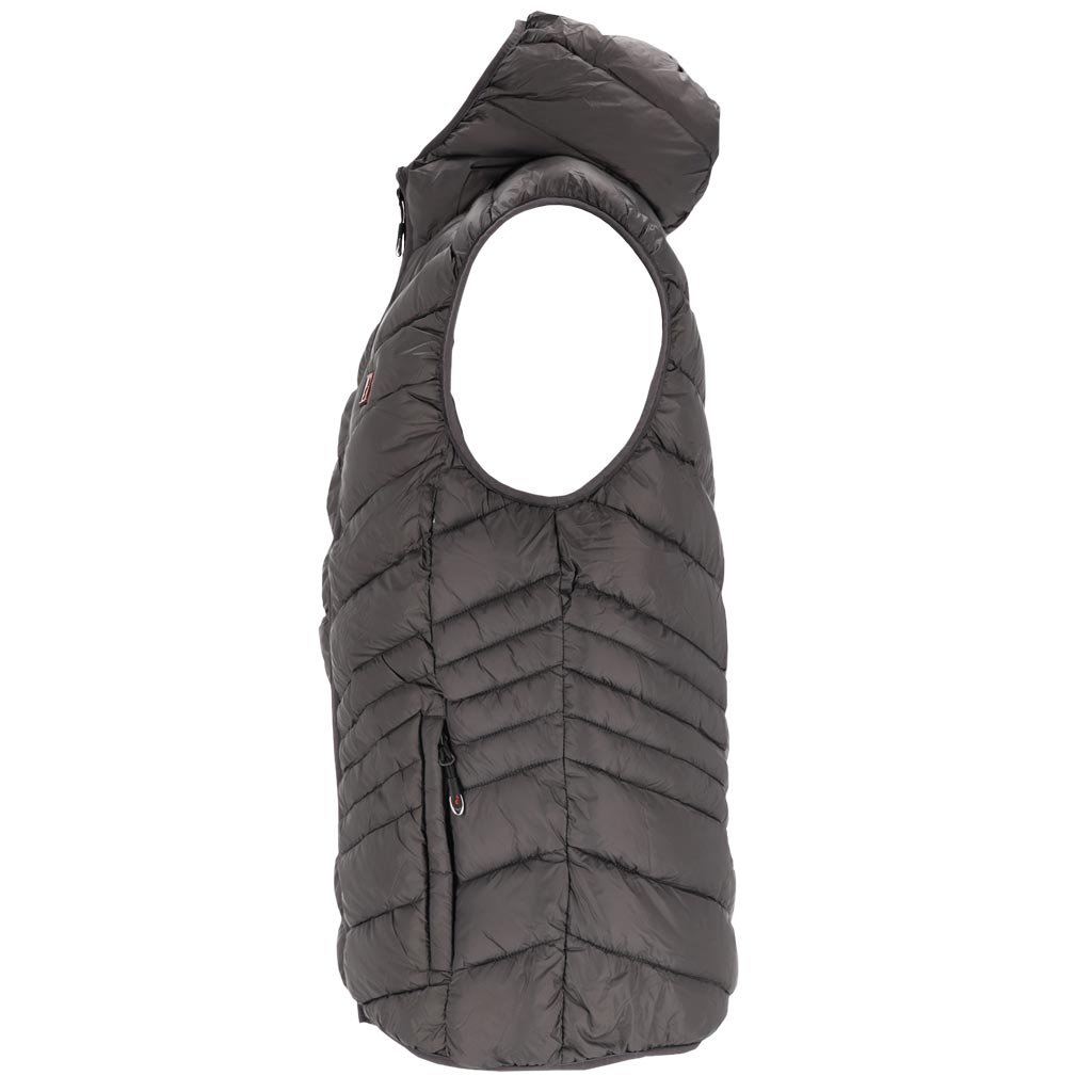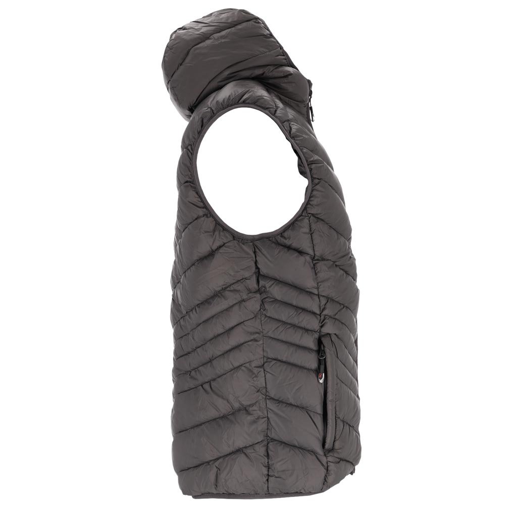 Zimná pracovná vesta REIS 5. - Materiál: 100% nylon, 35-36 g/m² - Výplň: 100% polyester, 270 g/m² - Podšívka: 100% polyester taft 190T, 52 g/m² - Zapínanie na zips - Kapucňa - Dve spodné vrecká so zipsami - Vnútorné vrecko so zapínaním na suchý zips - Ramená a spodný lem zakončené elastickým lemom - Strih: REGULAR